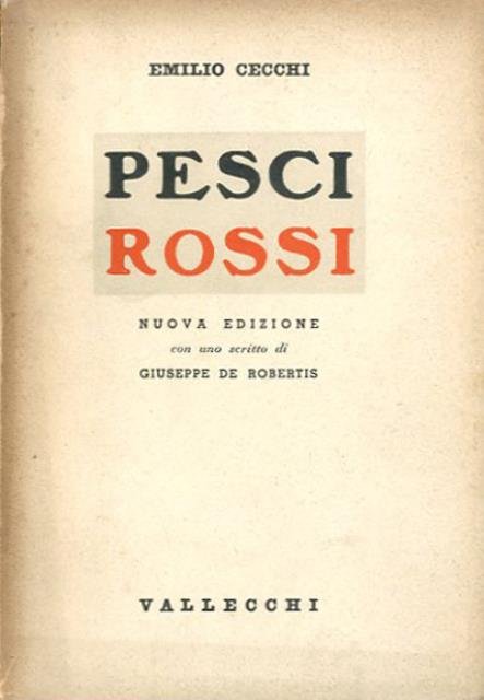 Nuova edizione. XXIV, 190 p. ; 20 x 14 cm. Pesci rossi di Emilio Cecchi, una raccolta di elzeviri, o prose d’arte, comparsa nel 1920, è il più deciso punto di svolta nella carriera di questo critico – scrittore e uno dei momenti più felici nella prosa italiana del Novecento. Il messaggio che trasmette è che il primo ventennio del secolo, caratterizzato dalle innovazioni e delle avanguardie, è finito, ha realizzato quello che poteva e ha esaurito le sue migliori energie. Alcuni anni prima Emilio Cecchi, in occasione di una mostra, aveva avuto modo di ammirare "I pesci rossi" di Matisse: al quadro lo scrittore si ispirò per un articolo, suscitando interesse e curiosità. Proprio con questo scritto, una riflessione sugli abitanti dei laghi orientali dalla inquietante natura bifronte, si apre questa raccolta, per poi proseguire con notazioni su argomenti tra i più diversi, quali il potere estetico e annichilente della neve sul paesaggio, l'incredibile boria umana nella creazione dei giardini zoologici o la elivagazione sul valore delle piccole cose che dimentichiamo di possedere. Ogni oggetto e ogni osservazione critica e quotidiana evocano uno scenario mentale di ricordi e suggestioni, creando la misura perfetta di un testo che va oltre i confini della critica letteraria. Con uno scritto di Giuseppe De Robertis. Brossura editoriale, coperta in cartoncino flessibile titolo impresso in rosso e nero al piatto e al dorso. Alcuni segni del tempo alla coperta (ingiallimento), al dorso con piccole lacerazioni, al taglio e alle pagine interne (ingiallimento), per il resto esemplare in buono stato. Firma di appartenenza nel frontespizio con data (1941), alcune sottolineature e annotazioni ms. a matita nel testo. Codice libreria 3680.