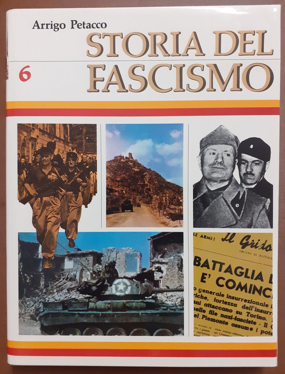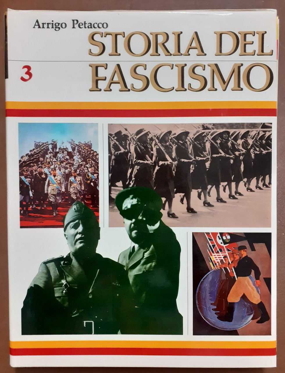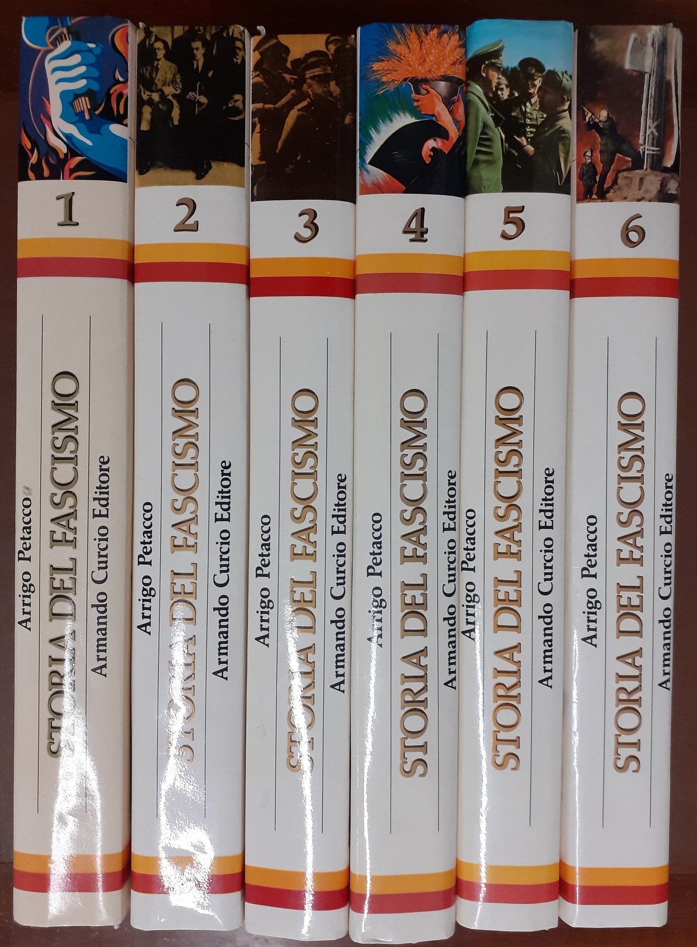 Arrigo Petacco, Storia del fascismo, presentazione di Denis Mack Smith, Armando Curcio Editore, Roma 1982, 6 voll., pp. totali 2274, ill. b.n. e col., cm 29, fascicoli sciolti completi di copertine in tutta tela ed. con titoli al dorso, decorazioni a impressione al piatto e sovraccoperte. Mancante il fascicolo n. 69 del sesto volume (pp. 2178-2208), per il resto opera completa. Settantuno fascicoli sciolti completi di copertine ed. originali in tutta tela, carte di guardia e frontespizi, per un totale di sei volumi. Le introduzioni ad ogni parte sono di Denis Mack Smith. Ottimo.