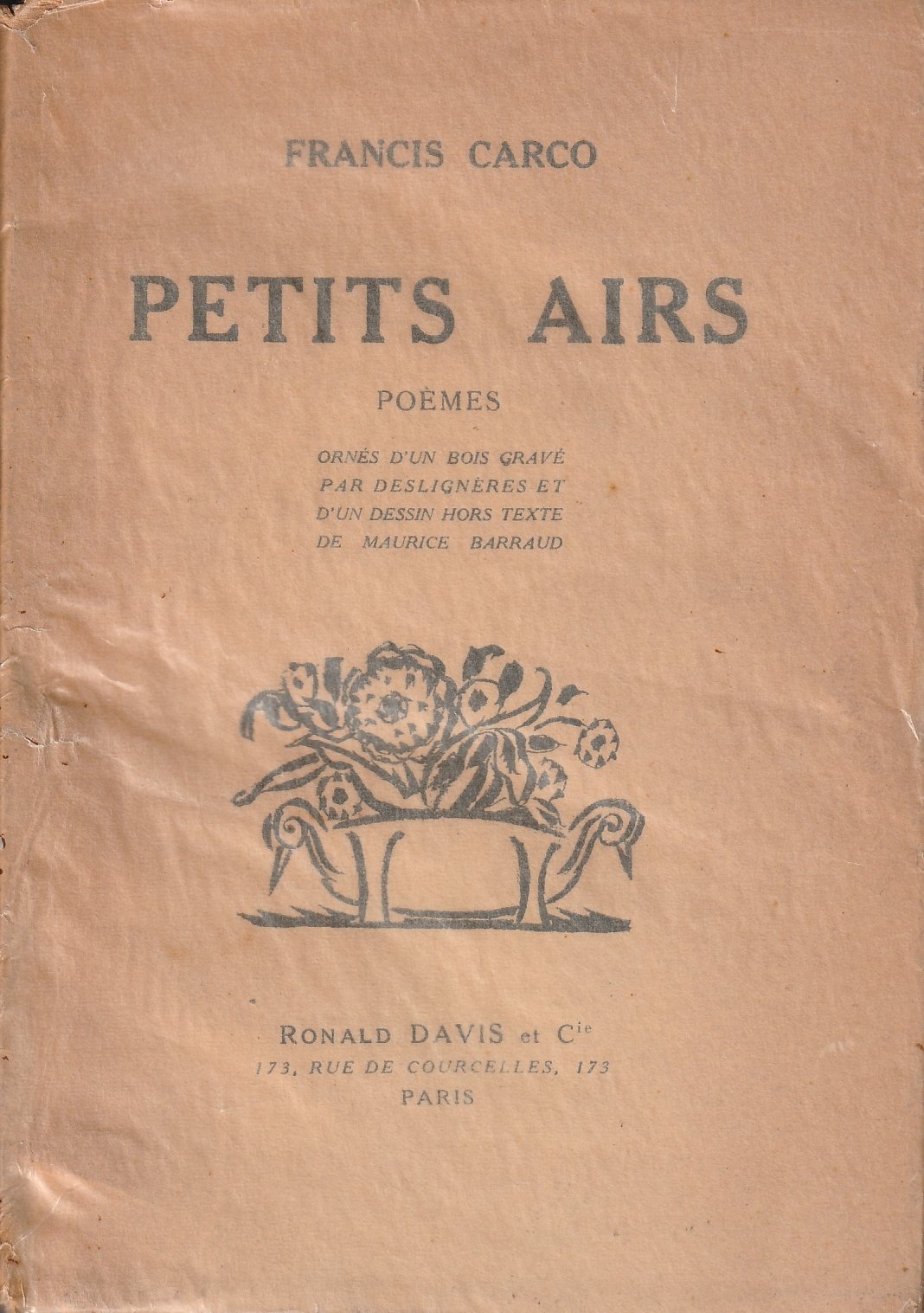 Brossura editoriale con alette, esemplare n. 318, testo in francese, una xilografia in b/n di André Desligneres nel testo, un disegno di Maurice Barraud fuori testo, dedica autografa all'occhietto (il nome del destinatario è cancellato), conserva pergamino protettivo, brossura brunita.