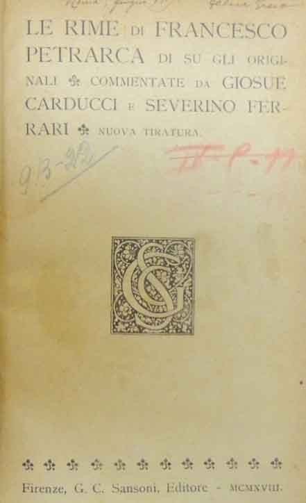 Le rime di Francesco Petrarca di su gli originali, commentate da Giosue Carducci e Severino Ferrari, nuova tiratura, G. C. Sansoni Editore, Firenze 1918, pp. XLV, 548, cm 20, legatura in mezza tela con titoli in oro al dorso. Esemplare rifilato. Firma d’appartenenza, data e segnatura di collocazione al frontespizio. Lievissime tracce d’uso alla cuffia superiore, per il resto perfetto.