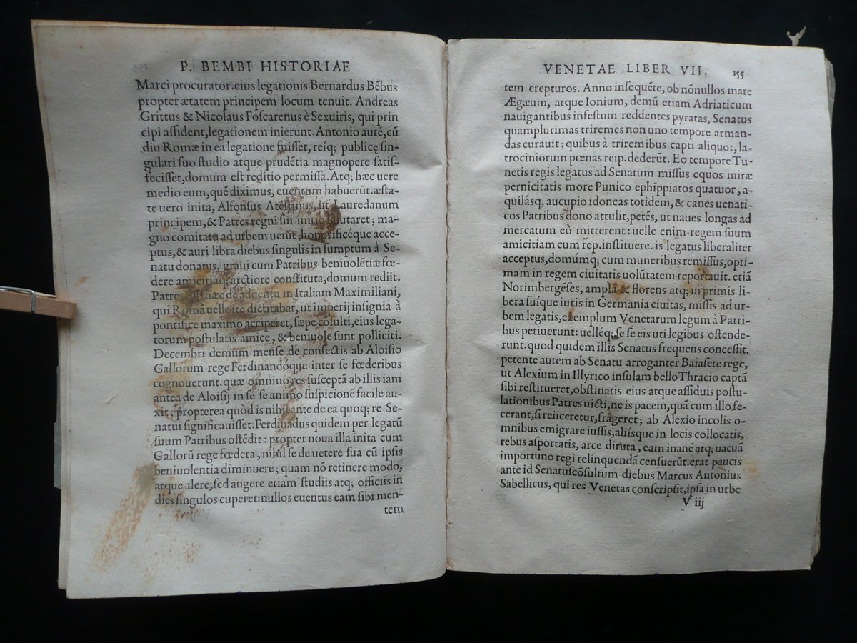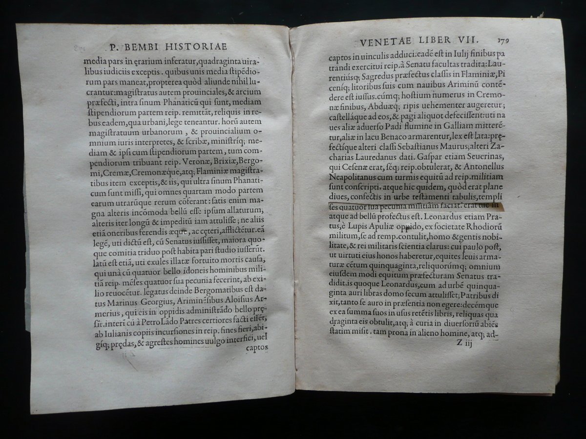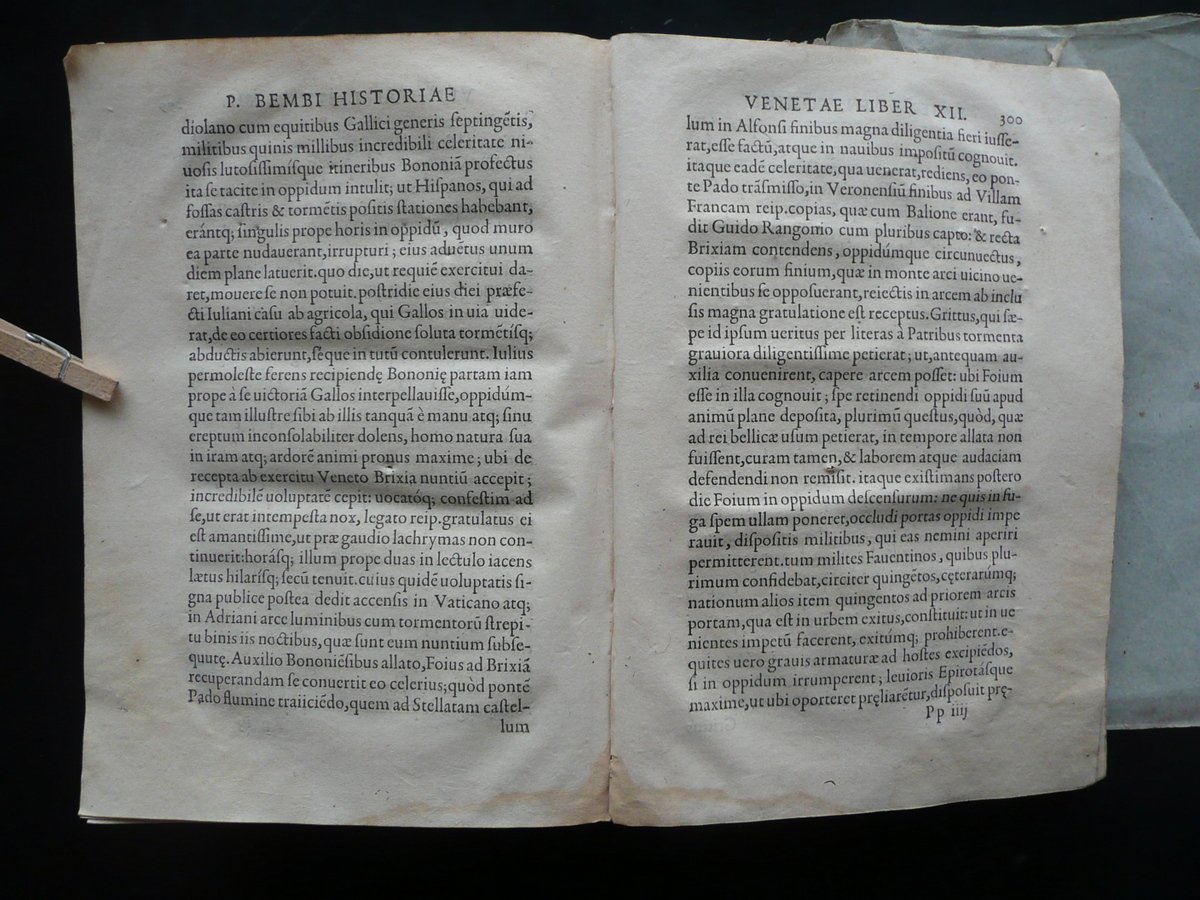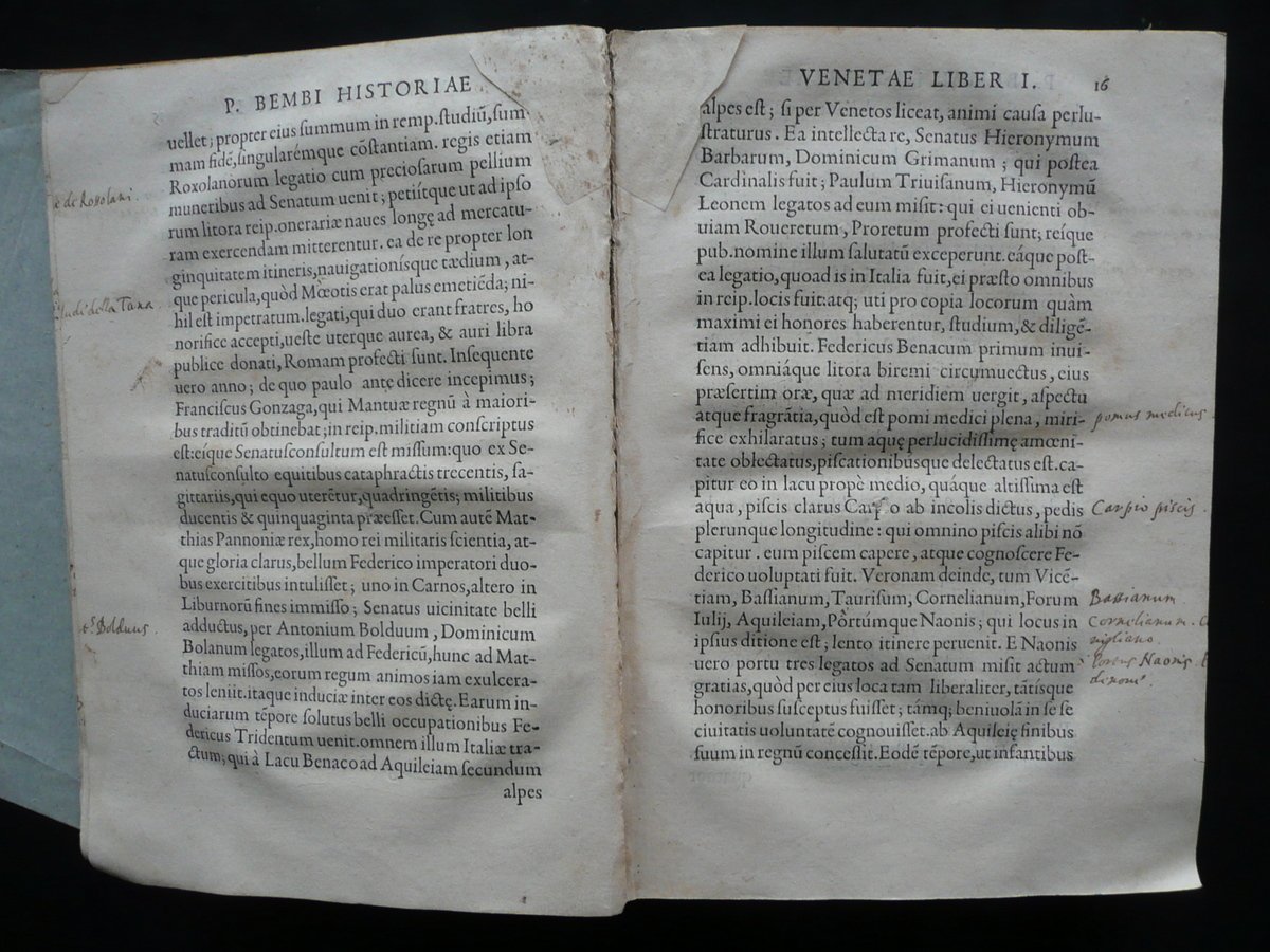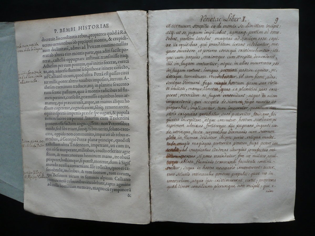 Cinquecentina, Petri Bembi Cardinalis Viri Clariss. Rerum Venetiarum Historiae Libri XII Ex Officina Michaelis Vascosani, via Iacobea ad insigne Fontis; Lutetiae 1551, cm 22x15,5, pp. [20]; 311, con qualche capolettera e fregio inciso; brossura d'epoca artiginalale in carta, con titolo annotato a mano al dorso. Condizioni di conservazione Esemplare in condizioni più che discrete con tracce d'uso e del tempo, qualche piccola lieve brunitura; brossura con alcune tracce di pieghe e qualche pieghetta; dorso con poche piccole mancanze e alcuni strappetti alle cuffie. Corpo del testo staccato dalla brossura ma esemplare compatto (vedi foto); frontespizio e qualche pagina con alcune glosse d'epoca ai margini (quelle al frontespizio sono state parzialmente rimosse); angolo inf. di qualcuna delle prime pagine con piccole mancanze, strappetti e difetti; margini sup. o inf. di alcune pagine con una piccola mancanza o camminamento da tarlo che interessano raramente e sempre in minima parte il testo (nella maggior parte dei casi la mancanza è stata restaurata mediante l'applicazione di una striscia di carta, vedi foto); pp. 9 - 10 mancanti ma integrate a mano (vedi foto); pagina 179 con una riga di testo rimossa (vedi foto). Poche circoscritte ombre di gore che non compromettono la lettura del testo. Reimpressione della prima edizione aldina, realizzata nello stesso anno. SETT90.L8266 N