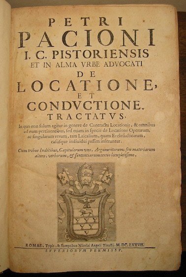 Petri Pacioni I.C. Pistoriensis et in alma urbe advocati De Locatione, et Conductione. Tractatus, in quo non solum agitur in genere de Contractu locationis, & omnibus ad eum pertinentibus, sed etiam in specie De Locatione Operarum, ac singularum rerum, tam laicalium, quam ecclesiasticarum, cuiusque individui passim inferuntur.