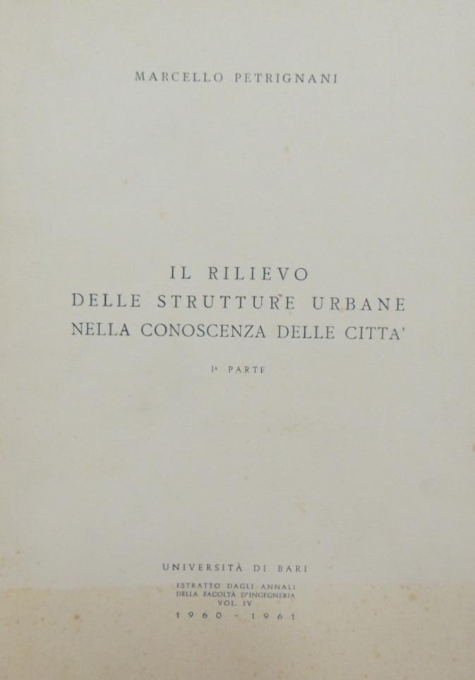 Marcello Petrignani, Il rilievo delle strutture urbane nella conoscenza delle città. Prima parte, Università di Bari, s.l. (ma stampato a Bari, presso l’Ind. Tip. Ditta Ved. Trizio) s.d. (1961?), pp. 17, 19 c. di tavv. f.t. ill. b.n., cm 24, br. ed. Estratto dagli Annali della Facoltà d’Ingegneria. Vol. IV. 1960-1961. Minime fioriture, per il resto perfetto.