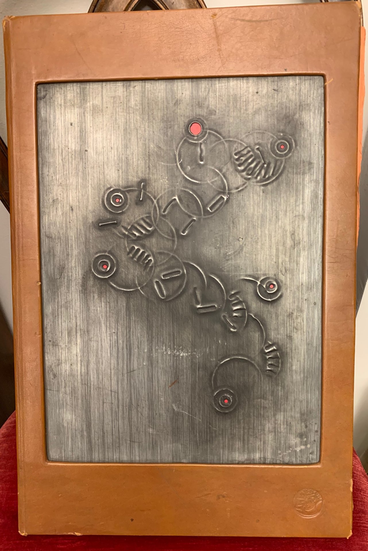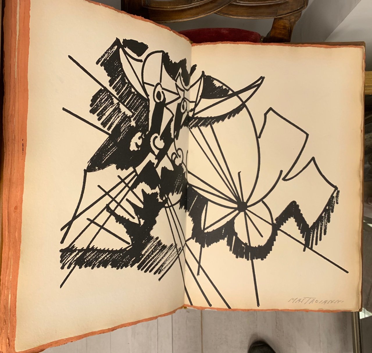>in-folio grande (mm 520X340), esemplare n. 32 su 100 totali impressi su carta a mano speciale, firmati a mano dall'artista. Con 16 disegni incisi nel testo e dieci incisioni originali f.testo, di cui 5 in rilievo, 2 a colori e 3 in nero, ognuna firmata a lapis da Mastroianni.e con importante legatura originale in pieno cuoio: sul primo piatto inserita una scultura originale in zinco dell'artista (differente in ognuno degli esemplari). Lussuosa pubblicazione, realizzata con la collaborazione di vari artisti e specialisti, non comune. Esemplare in perfetto stato. With 5 engravings in relief, 2 color lithographs, 3 black-and-white lithographs, each signed and numbered, and vignette illustrations by Mastroianni. 500x330 mm; 19 3/4x13 inches (sheets), full margins. Folio, hand-bound by Gayet in calf with a unique zinc relief sculpture on front cover, engraved signature, lower right, some light surface rubbing, mostly to edges and tips, few light scuffs; binding glue dried leaving contents loose. number 32 of only 100 copies signed by Mastroianni