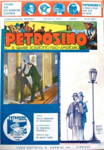 Petrosino. Il grande poliziotto italo-americano. Testo: Dalle memorie di Petrosino. Illustrazioni di Tancredi Scarpelli. Testata 1934 di Giove Toppi. Presentazione di Romolo Baccani.