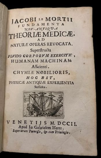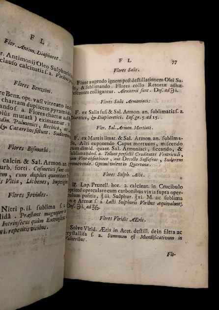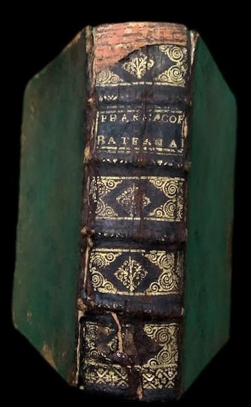 In 8° (16,1x10 cm); (4), 337 [i. e. 327], (31), 301, (3) pp. Il frontespizio della seconda parte è posto all'inizio dell'opera mentre il frontespizio della Pharmacopeia non è mai stato aggiunto in questo esemplare. Nella prima parte omesse nella numerazione le pagine da 321 a 330, nella seconda parte pagina 287 numerata, erroneamente, 187. Legatura coeva in piena pelle con dorso a 4 nervi, titolo e fregi impressi in oro al dorso. Qualche difetto e segno del tempo. All'interno in ottime condizioni di conservazione. Antica nota di possesso privato al recto del piatto anteriore Del Sig. Dotore Iurdano. La prima opera contiene la quarta edizione della celebre farmacopea del noto fisico inglese, George Bate (16081668) che fu medico personale di Oliver Cromwell e di Carlo II. Fu uno dei membri fondatori della Royal Society. L'opera contiene la farmacopea di Bate nella quale sono presenti le ricette per la creazione di numerosissimi prodotti di farmacia. La farmacopea è, in quest'edizione, legata con l'opera del noto medico e chimico olandese, Jacobus le Mort anche, Jacob la Mort (13 ottobre 1650 ad Arnhem, 1 marzo 1718 a Leida). Jacob nacque in una famiglia di farmacisti studiando filosofia all'Università di Leida sotto Johannes Raei (1622-1702) e David Stuart (1627-1669). Dopo gli studi lavorò dal 1667 nella farmacia di Johann Rudolph Glauber ad Amsterdam ed in seguito, aprì un suo laboratorio chimico a Leida nel 1672 dopo la morte di Glauber. Nel suo laboratorio teneva regolarmente lezioni di farmaceutica e botanica. Nel 1678 ottenne il dottorato in medicina. Nel 1690 divenne docente di chimica a Leida divenendo rettore dell'Alma Mater nel 1706. Fu uno dei divulgatori delle teorie cartesiane. L'opera qui presentata è un dotto trattato di chimica e farmaceutica con la descrizione di diversi esperimenti chimici innovativi per l'epoca. Non comune edizione delle due opere. Rif. Bibl.: IT\ICCU\RLZE\021746.