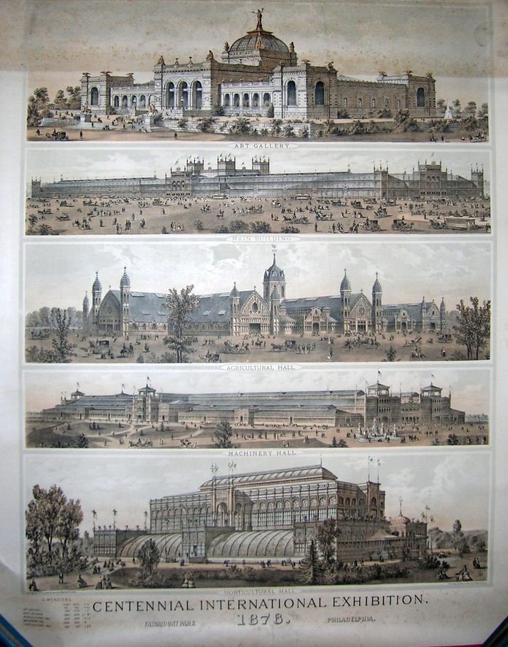 Original print of the Centennial International Exhibition of Philadelphia 1878 (cm. 76 x 61 / 30 x 24 inch.). Five tinted views of some buildings for the Centennial International Exhibition: Art Gallery; Main Building; Agricultural Hall; Machinery Hall; Horticultural Hall. Published by Tho.s Hunter, Copyrighted, 1878 by The Centennial Board of Finance.