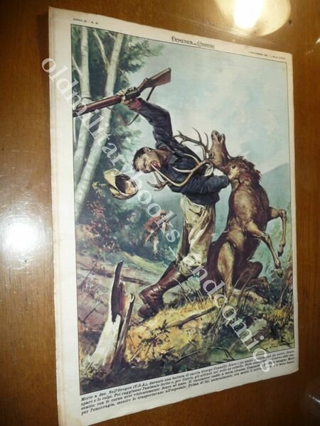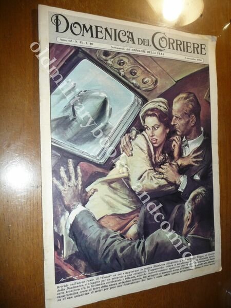 DESCRIZIONE: Domenica del Corriere, Anno 62 n. 45 (6 novembre 1960) COPERTINA: Brivido sull'aereo reale su cui viaggiavano la regina Elisabetta d'Inghilterra e il pricipe Filippo. RETRO: Morte di un cacciatore durante una battuta di caccia in Oregon. La Domenica del Corriere è stato un popolare settimanale italiano fondato a Milano nel 1899 e chiuso nel 1989. Apparve per la prima volta nelle edicole l'8 gennaio 1899 come supplemento illustrato del Corriere della Sera. Stampata in grande formato (sul modello del domenicale La Tribuna illustrata), aveva 12 pagine e veniva distribuita gratis agli abbonati del Corriere, oppure si poteva acquistare in edicola per 10 centesimi. La prima e ultima di copertina erano sempre disegnate. Il Corriere si avvaleva di un giovane disegnatore, Achille Beltrame, allora sconosciuto, a cui veniva affidato in ogni numero il compito di rendere con la sua tavola il fatto più interessante della settimana. Dopo la sua morte nel 1945, fu sostituito da Walter Molino che, come il suo predecessore, firmò memorabili copertine. A differenza dei settimanali dell'epoca, la Domenica del Corriere diede ampio spazio alle fotografie e ai disegni, e questo fu uno dei motivi del suo successo. CONDIZIONI: Ottime. PESO / WEIGHT: 200 gr. without package