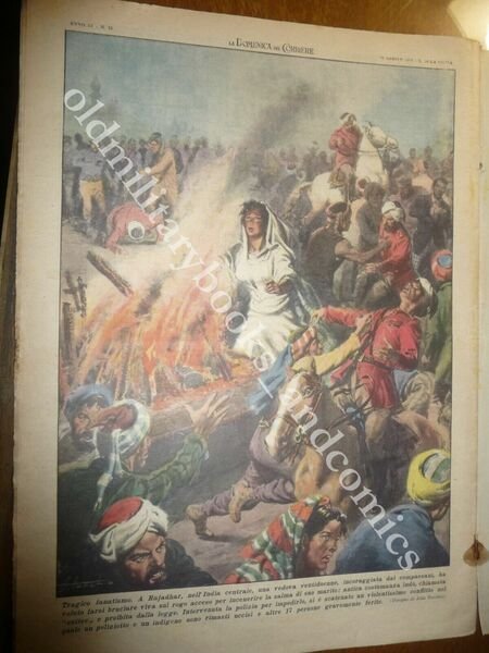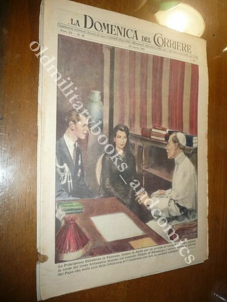 DESCRIZIONE: Domenica del Corriere, Anno 53 n. 16 (22 aprile 1951) COPERTINA: La principessa Elisabetta in Vaticano. Giunta in Italia per un periodo di vacanze in forma privata, la erede del trono britannico, insieme al consorte Filippo di Edimburgo, è stata ricevuta in udienza dal Papa che, nella sala della biblioteca, si è trattenuto con loro in un cordilale colloquio. RETRO: Suicidio di una vedova in India. La Domenica del Corriere è stato un popolare settimanale italiano fondato a Milano nel 1899 e chiuso nel 1989. Apparve per la prima volta nelle edicole l'8 gennaio 1899 come supplemento illustrato del Corriere della Sera. Stampata in grande formato (sul modello del domenicale La Tribuna illustrata), aveva 12 pagine e veniva distribuita gratis agli abbonati del Corriere, oppure si poteva acquistare in edicola per 10 centesimi. La prima e ultima di copertina erano sempre disegnate. Il Corriere si avvaleva di un giovane disegnatore, Achille Beltrame, allora sconosciuto, a cui veniva affidato in ogni numero il compito di rendere con la sua tavola il fatto più interessante della settimana. Dopo la sua morte nel 1945, fu sostituito da Walter Molino che, come il suo predecessore, firmò memorabili copertine. A differenza dei settimanali dell'epoca, la Domenica del Corriere diede ampio spazio alle fotografie e ai disegni, e questo fu uno dei motivi del suo successo. CONDIZIONI: Ottime con azzurrina. PESO / WEIGHT: 200 gr. without package