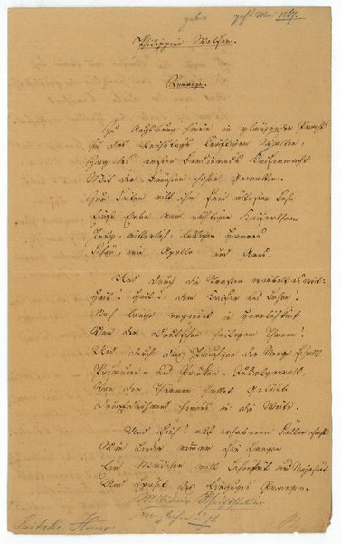 4 SS. auf Doppelblatt. 8vo. Eine Romanze in 12 Strophen zu je 8 Zeilen: "Zu Augsburg hinein in glänzender Pracht | Zu des Reichstag's kräftigem Walten, | Zog des ersten Ferdinand's Kaisermacht | Mit der Fürsten hohen Gewalten. | Zur Seiten ritt ihm sein ältester Sohn | Fürst Erbe vom mächtigen Kaiserthron | Jung, ritterlich, lockigen Haares | Schön, wie Apollo und Ares [.]". - Heinrich Beitzke nahm 1845 als Major seinen Abschied und lebte fortan als freier Schriftsteller in Köslin. "1858-62 für den Wahlkreis Anklam, danach für Hamm-Soest Mitglied des preußischen Abgeordnetenhauses, nahm Beitzke auf seiten der Fortschrittspartei u. a. regen Anteil an der Reorganisation des Heeres. Er verfaßte u. a. die Geschichte der deutschen Freiheitskriege in den Jahren 1813 und 1814" (DBE). - Papierbedingt etwas gebräunt und mit kleinen, in die Unterschrift hineinreichenden Randläsuren.