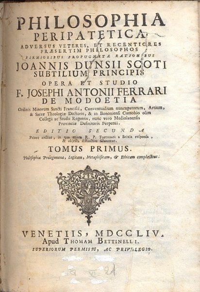Philosophia peripatetica adversus veteres, et recentiores praesertim philosophos firmioribus propugnata rationibus joannis Dunsii Scoti Subtilium Principis.