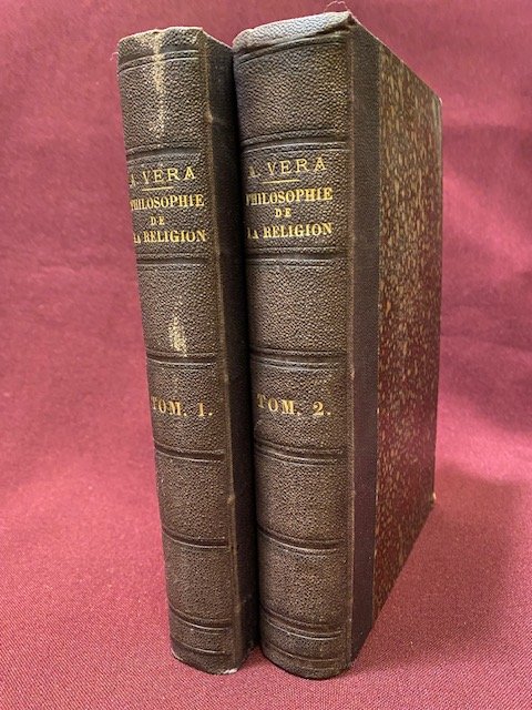 Opera in due volumi con legatura coeva mezza tela, titoli in oro al dorso, piatti in carta marmorizzata, ex libris nobiliare inciso ai contropiatti, condizioni ottime. Prima traduzione francese ad opera di A. Vera della Filosofia della Religione di Hegel. Sc. S.