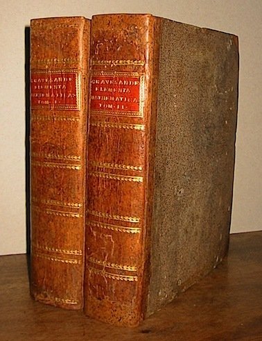 4to (cm. 25,2), 2 Voll., 2 cc.nn., LXXXVI pp., 1 c.nn., 572 pp.; 1 c.nn., da p. (1)574 a p. 1073(1), 21 cc.nn. Complessive CXXVII tavv. rip. f.t. Frontis. in rosso nero con vignetta calcografica. Legature inizi ‘800 in mz. pelle con angoli. Fili e titoli oro su tassello al ds. Tagli rossi. Restauri ben eseguiti ai ds. Ottimi, freschi interni. Terza edizione, molto ampliata, di un’opera fondamentale nella divulgazione delle teorie newtoniane.