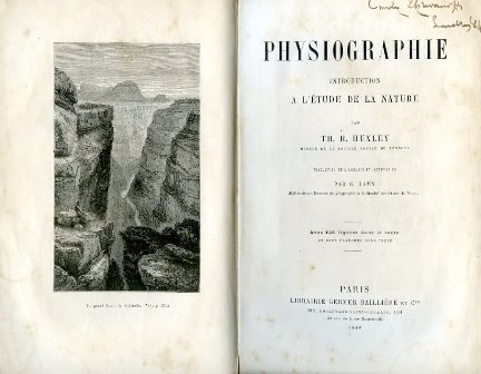 In-8°, pp. XVI, 415, cartonatura marmorizzata moderna con tit. in oro su tassello in pelle al dorso. In fine due tavv. ripiegate in litografia a colori incise da Erhard su disegno di G. Lamy, una dell'idrografia e del livellamento del bacino della Senna e una della stratigrafia geologica del medesimo bacino basata sulla carta geologico-idrografica di Belgrand. Antiporta fig. in silografia. 128 illustrazioni silografiche e litografiche intercalate n.t. Alcune firme di privata appartenenza. Fioriture ed aloni sparsi, ma buon esemplare. Prima traduzione francese, di G. Lamy. L'opera tratta della pioggia e dei fenomeni atmosferici, dell'evaporazione, della composizione atmosferica, della composizione chimica delle acque, del mare, dei terremoti e delle eruzioni vulcaniche, delle oscillazioni del disco solare, della formazione del suolo a causa degli agenti animali, della costituzione geologica del bacino della Senna, della distribuzione delle terre e delle acque, del disegno delle carte terrestri, dei movimenti della Terra. L'Huxley (Ealing, Londra, 1825-Eastbourne, 1895), tra i principali scienziati del XX secolo, in gioventù medico della marina militare britannica, nel suo viaggio di quattro anni sulla 'Rattlesnake' raccolse, nei mari australiani, numerosissimi invertebrati e meduse che furono il primo oggetto dei suoi studi zoologici. In Inghilterra si occupò della paleontologia dei pesci fossili e, dopo la pubblicazione dell'Origine della specie', divenne il più acceso fautore del darwinismo e delle teorie evoluzionistiche in accordo con le sue tesi sui legami genetici tra le varie forme animali ('On the theory of the Vertebrate Skull'), fornendo una nutritissima serie di contributi sperimentali e dottrinali alle idee evoluzionistiche. Tra le altre sue opere merita di essere ricordato 'Zoological Evidence as to Man's Place in Nature'. I suoi 'Collected Essays' uscirono in 9 voll. a Londra tra il 1893 e il '94. Sull'Huxley, 'Life and Letters of T. H. H. by his son Leonard Huxley', Londra, 1900.