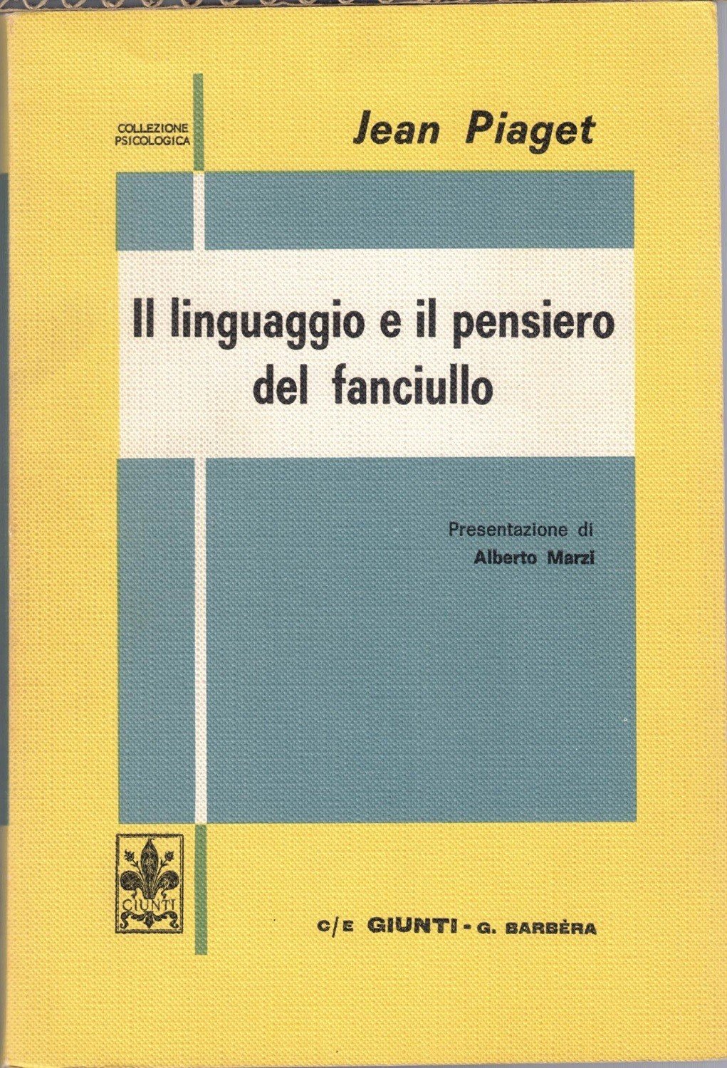 Jean Piaget, Il linguaggio e il pensiero del fanciullo, traduzione di Carla Musatti Rapuzzi, prefazione di Edouard Claparède, presentazione di Alberto Marzi, C/e Giunti G. Barbera, s.l. (ma stampato a Firenze, presso gli Stabilimenti Grafici Bemporad Marzocco) 1970, terza rist., pp. XVI, 285, cm 20, br. ed. Collana Collezione psicologica. Titolo originale: Le langage et la pensée chez l’enfant. Piccola firma d’appartenenza al frontespizio. Leggere tracce d’uso, tenue brunitura della carta, per il resto esemplare ben conservato.