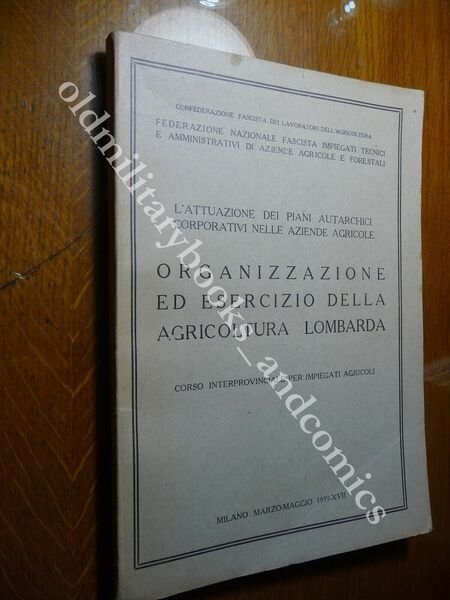 TITOLO: L'ATTUAZIONE DEI PIANI AUTARCHICI CORPORATIVI NELLE AZIENDE AGRICOLE ORGANIZZAZIONE ED ESERCIZIO DELLA AGRICOLTURA LOMBARDA DESCRIZIONE: Arte della Stampa Roma 1939 br. ed. pp. 156 in 8°. La parte agraria nel difficile periodo dell'Autarchia. CONDIZIONI: Buone piccola pieghetta alla cop. PESO / WEIGHT: 300 gr. without package