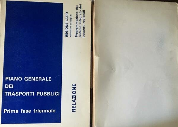 Copertina cartonata lievemente sporca e ingiallita, pagine lievemente ingiallite. Due volumi, Piano dei trasporti pubblici Regione Lazio, Relazione e Tavole. Molto raro. Buono (Good) .