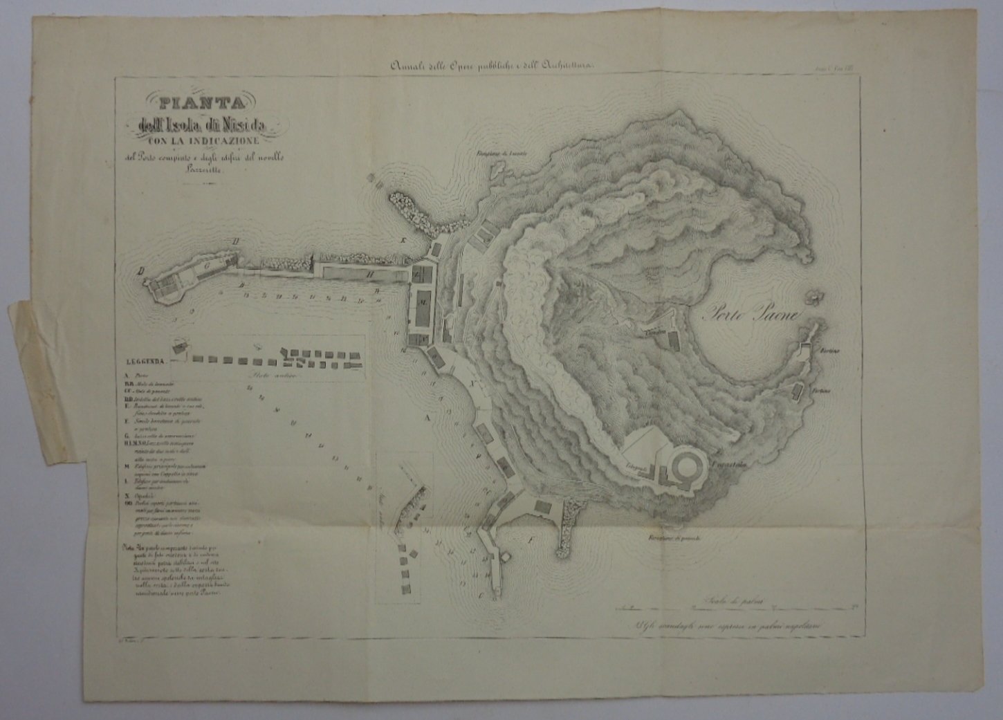 Tavola di 43x33 cm (+ margine bianco) ripiegata. La più bella carta geografica ottocentesca di Nisida, tratta dagli Annali delle Opere pubbliche e dell'Architettura (Anno V). Ottime condizioni, nonostante le pieghe originali.