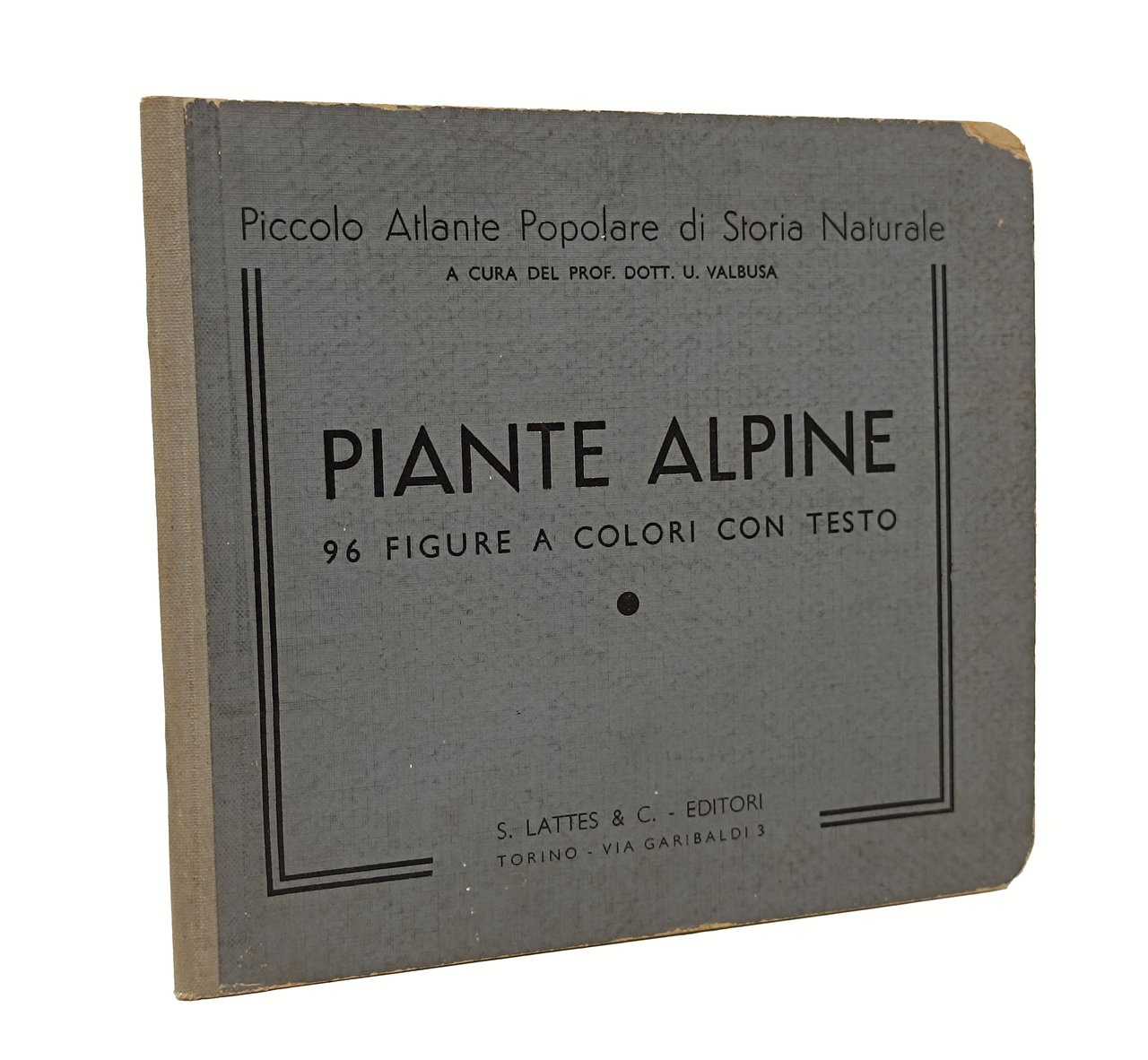 Piccolo Atlante popolare di Storia Naturale a cura del Prof. Dott. U. Valbusa ('Volumetti illustrati con molte figure a colori, pregevoli di nitidezza e rispindenza al vero, con breve ma chiaro testo di commento. Sono stampati su forte cartoncino con dorso in tela. Si vendono separatamente'). Nuova Serie. Formato: 15 x 18 cm circa. 96 figure a colori con testo. S. Lattes & C. editori, Torino. Pagine non numerate (27 + frontespizio in totale). Senza data. Stato di conservazione: piccole e marginali abrasioni sulla copertina in particolare sull'angolo superiore del piatto anteriore, una piccola eticetta in carta, con il nome dell'ex proprietario, incollata sul frontespizio ma, nel complesso, un buon esemplare.
