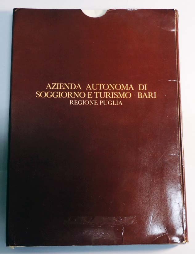 Regione Puglia - Azienda Autonoma di Soggiorno e Turismo - Bari, Piante topografiche di Bari e le sue frazioni, s.n., s.l., (ma stampato a Bari, presso la Italgrafica Sud e la Zincolito Albrizio) s.d. (197?). Cofanetto in cartoncino editoriale contenente n. 8 carte topografiche a colori ripiegate cm 87x64 raffiguranti i vari quartieri e frazioni di Bari e un fascicoletto di 8 cc. non numerate con note storiche sugli stessi stilate da Vito Maurogiovanni, Italo Scarpa, Federico Pirro, Michele Campione, Ettore De Marco, Ignazio Schino. Lievi tracce d'uso al cofanetto, piccola abrasione al dorso di una carta, per il resto perfetto. Rarissimo.