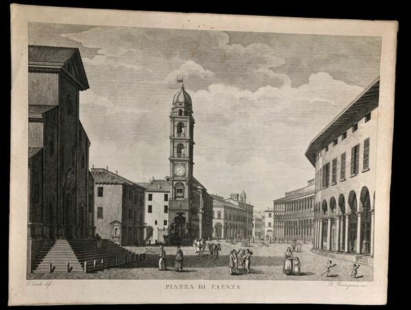 31,9×41,6 cm; bella e celebre incisione in rame allacquaforte rappresentante una veduta del centro di fu Fusignano. In basso a destraB. Rosaspina inc., in basso a sinistra C. Conti dis.. Esemplare in ottime condizioni di conservazione. Il foglio venne pubblicato in una serie di tavole realizzate da Bernardo Rosaspina, dal titolo Ventisette incisioni rappresentanti diversi luoghi della Romagna disegnati stampati in anni diversi tra il 1830 ed il 1840. Bernardino Rosaspina (Bologna 1797 Bologna 1882), appartenente ad una celeberrima famiglia di incisori, era figlio di Giuseppe (Bologna 1765 ivi 1832), e nipote di Francesco (Montescudo, Rimini, 1762 Bologna 1841). Bernardino, conosciuto anche come Bernardo, concentrò la sua arte nella realizzazione di vedute che divennero ben presto molto apprezzate e richieste per la pulizia del tratto. Foglio in ottime condizioni di conservazione.