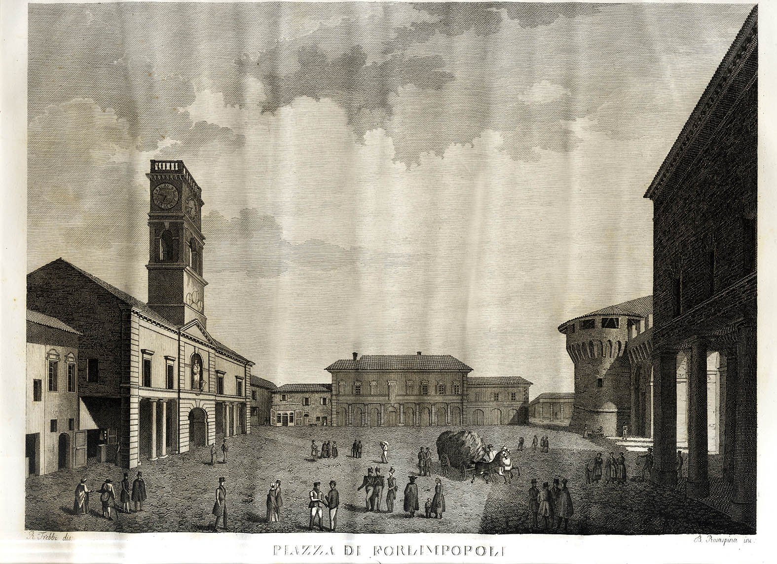 >Incisione in rame, mm 660x440), fresca e con ampi margini, che fa parte di una serie di 35 vedute di paesi della Romagna che Rosaspina pubblicò separatamente a Bologna tra il 1831 e il 1836, a dispense in sottoscrizione, mentre i vari disegnatori andava incidendo nelle città e nei paesi romagnoli. Per questo pochissimi furono gli esemplari rilegati in album, e sono variabili nel numero delle tavole (la raccolta più completa consta di 33 tavole). Anche le tavole sciolte sono rare.L'edizione manca di organicità e di un titolo generale: si conoscono fino a 35 vedute di Rimini, Cattolica, Santarcangelo, Cesena, Forlimpopoli, Forlì , Faenza , Castelbolognese, Imola, Brisighella , Fognano, Riolo, Castelsanpietro, Ravenna, Massalombarda, Lugo, Fusignano, Cotignola, Bagnacavallo e Ferrara, che costituiscono un irrinunciabile documento iconografico della Romagna preunitaria, dal momento che traccia un itinerario fatto non solo di rinomate città, quali Rimini e Ravenna, ma anche di piccoli centri sino ad allora quasi del tutto sconosciuti ai viaggiatori. Le vedute sono incise dal veneto Bernardino Rosaspina, (1797-1882), appartenente ad una folta schiera d'incisori di origini romagnole, che ha lasciato il segno nell'arte incisoria nella prima metà dell'800.