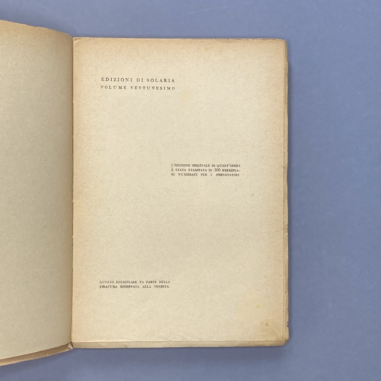 16°, cm 20, pp. 217, brossura editoriale con titoli in rosso e nero al piatto. Opera prima di Vittorini. Edizioni di Solaria volume ventunesimo. Tirato in trecento copie numerate più la tiratura riservata alla vendita. Nostro non numerato. Stampato a spese dell'autore. Contiene otto racconti di cui sei già apparsi su Solaria e altri periodici. Ottimo esemplare genuino. Leggere macchioline al solo piatto anteriore. Una data a matita sulla prima carta bianca con lacuna all'angolo esterno.. *** TUTTI I NOSTRI LIBRI SONO VISIBILI PREVIO CONTATTO MAIL O TELEFONO NELLA NUOVA SEDE DI MILANO: LIBRERIA COSMOPOLIS, VIA JOMMELLI, 22. ***