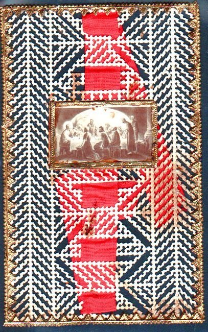 Piccola fotoincisione raffigurante l'Ultima Cena, applicata su raffinato supporto trinato con nastro rosso passante.