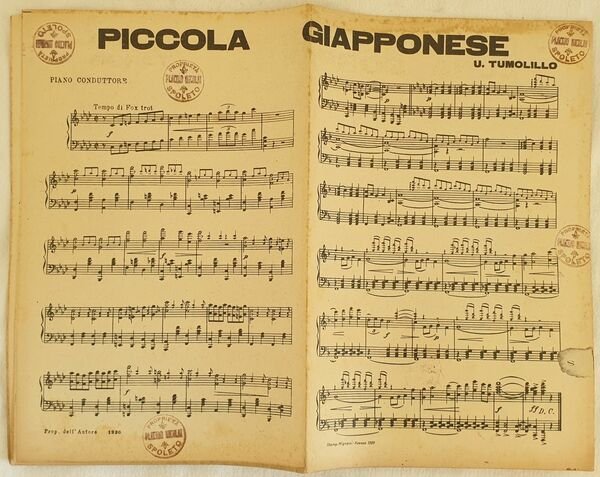 Partitura completa per orchestra del 1930 di due melodie "Piccola giapponese" e "Luna sorridi!." di U. Tumolillo. Copertina assente. GENERE: Tango STRUMENTI: pianoforte, violini; violoncello, tromba; trombone batteria, clarinetto, sassofono, contrabbasso ANNO: 1930 DIMENSIONI: In 8. cm 27x17,5 PAGINE: pp. 24 CONDIZIONI: Buone condizioni. Copertina assente. Ex libris sulle pagine Beautiful score of two songs of 1934, a complete score for orchestra of the melodies "Piccola giapponese" and "Luna sorridi!." by U. Tumolillo. MUSIC: Tango STRUMENTI: piano, violins; violoncello, trumpet; trombone, drums, clarinet, saxophone, contrabbass<BR>YEAR: 1930 SIZE: In 8. cm 27x17,5. PAGES: pp. 24 CONDITIONS: Good conditions. Cover lacks<BR>NOTES: Ex libris in the pages