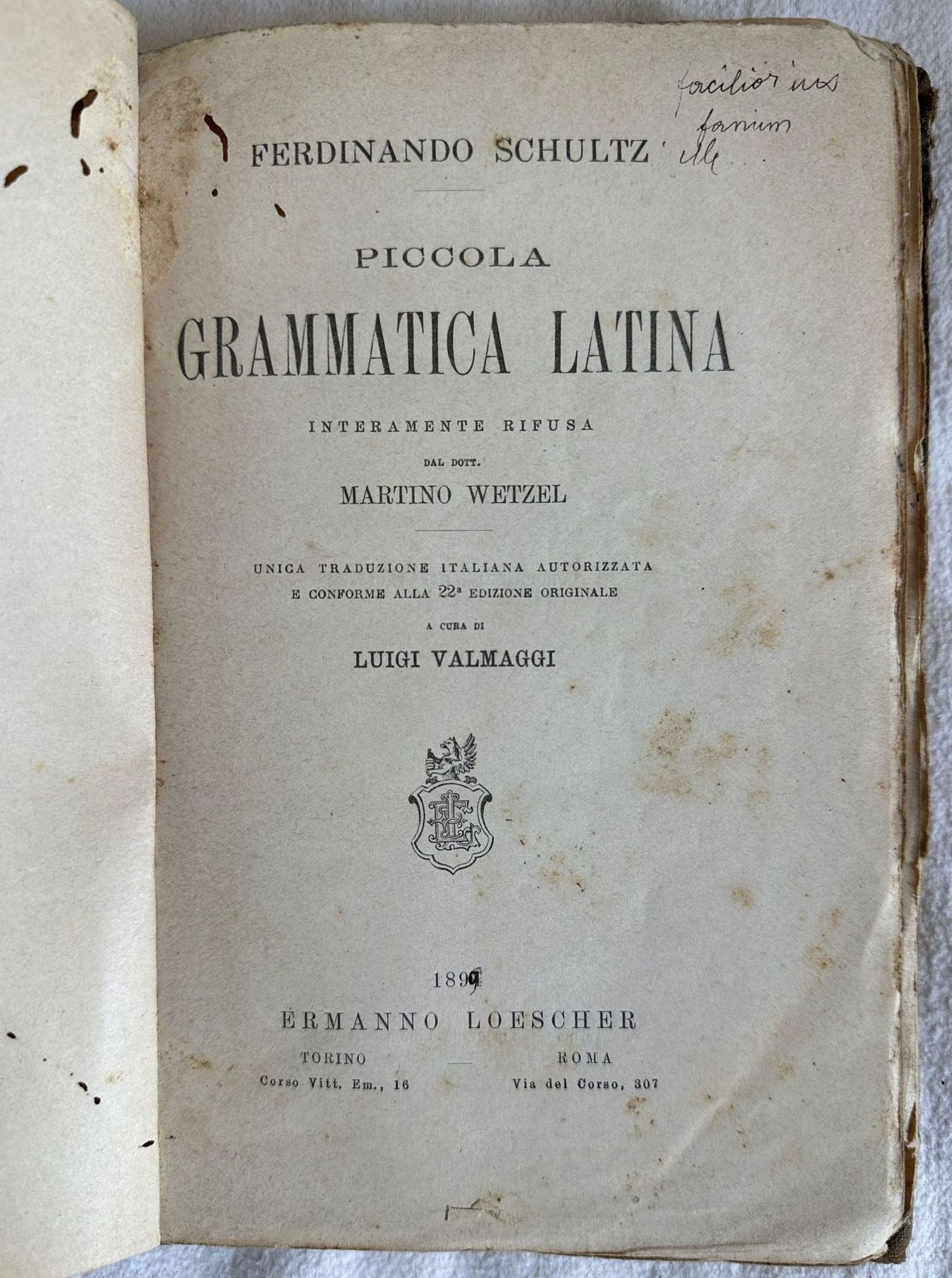 Edizione del 1899 di questa grammatica latina scritta da Ferdinando Schultz corretta da Martin Wetzel. Traduzione a cura di Luigi Valmaggi. Antiche note manoscritte. In discrete condizioni. Copertina in mezza tela in mediocri condizioni generali con usure e rotture ai margini e dorso. Legatura in mediocri condizioni con rotture. All'interno le pagine si presentano in discrete condizioni con fioriture. Qualche piccolo segno di tarlo. In 8. cm 21x14,5. Pp. VIII+304.Edition of 1899 of this latin grammar written by Ferdinando Schultz corrected by Martin Wetzel Translation by Luigi Valmaggi. Antique handwritten notes. In fair conditions. Half cloth cover in poor general conditions with wearings and cracks in the extremities. Binding in poor conditions with cracks. Inside pages are in fair conditions with foxing. Some little worming. In 8. cm 21x14,5. Pp. VIII+304.<BR><BR> <BR><BR><BR><BR>