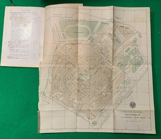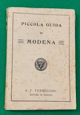 In 8° piccolo; 64, 162 pp. e una grande c. di tav. con cartina di Modena. Brossura editoriale. Qualche piccolo foxing al piatto anteriore. Un piccolo difetto al dorso. Un piccolo strappetto al margine interno della carta, senza perdita di carta ed ininfluente e nel complesso esemplare in buone condizioni di conservazione. Seconda edizione ma prima con l'Indicatore della Città di Modena, di questa guida di Modena stampata dal celebre stampatore modenese, Angelo Fortunato Formiggini. Non comune. L'indicatore modenese contiene centinaia di pubblicità di attività locali, molte in stile liberty. Frontespizio della prima opera in rosso e nero disegnato da Umberto Tirelli come da monogramma nella parte bassa a sinistra. La pianta della città venne realizzata dal prof. Zagni. Non comune guida di Modena.