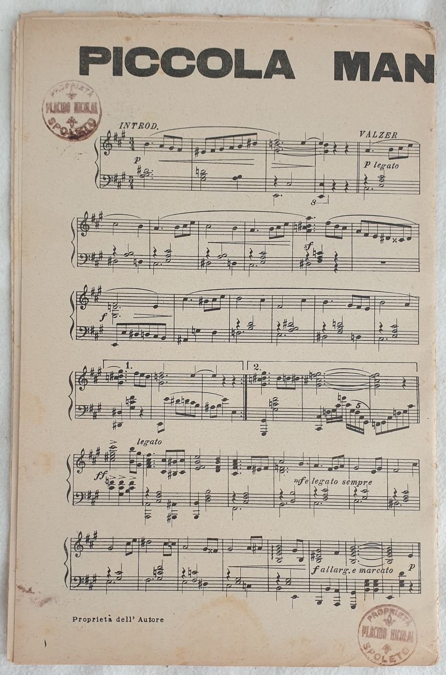 Partitura completa per orchestra del 1930 delle melodie "Piccola Manon", "Diversivo" di U. Tumolillo. Copertina assente. GENERE: Black Bottom STRUMENTI: pianoforte; violini; violoncello, flauto; tromba; trombone, batteria, contrabbasso, clarinetto, sassofono ANNO: 1930 DIMENSIONI: In 8. cm 27x18 PAGINE: pp. 24 CONDIZIONI: Buone condizioni. Ex libris sulla copertinaBeautiful score of one song of 1930, a complete score for orchestra of the melodies "Piccola Manon", "Diversivo" by U. Tumolillo. Cover lacks MUSIC: Romanza STRUMENTI: piano; violins; violoncello, flute, trumpet, trombone, drums, contrabbass, clarinet, saxophone <BR>YEAR: 1930 SIZE: In 8. cm 27x18. PAGES: pp. 24 CONDITIONS: Good conditions. NOTES: Ex libris in the cover