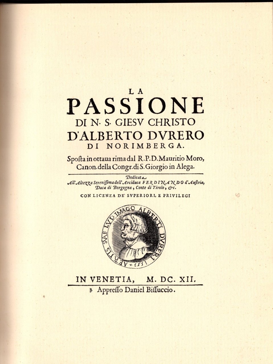 La "Piccola Passione", incisa tra il 1509 e il 1510, è una delle opere maggiori di Albrecht Durer qui riproposta dalla rarissima edizione veneziana del 1612, con il commento in rima di Maurizio Moro.