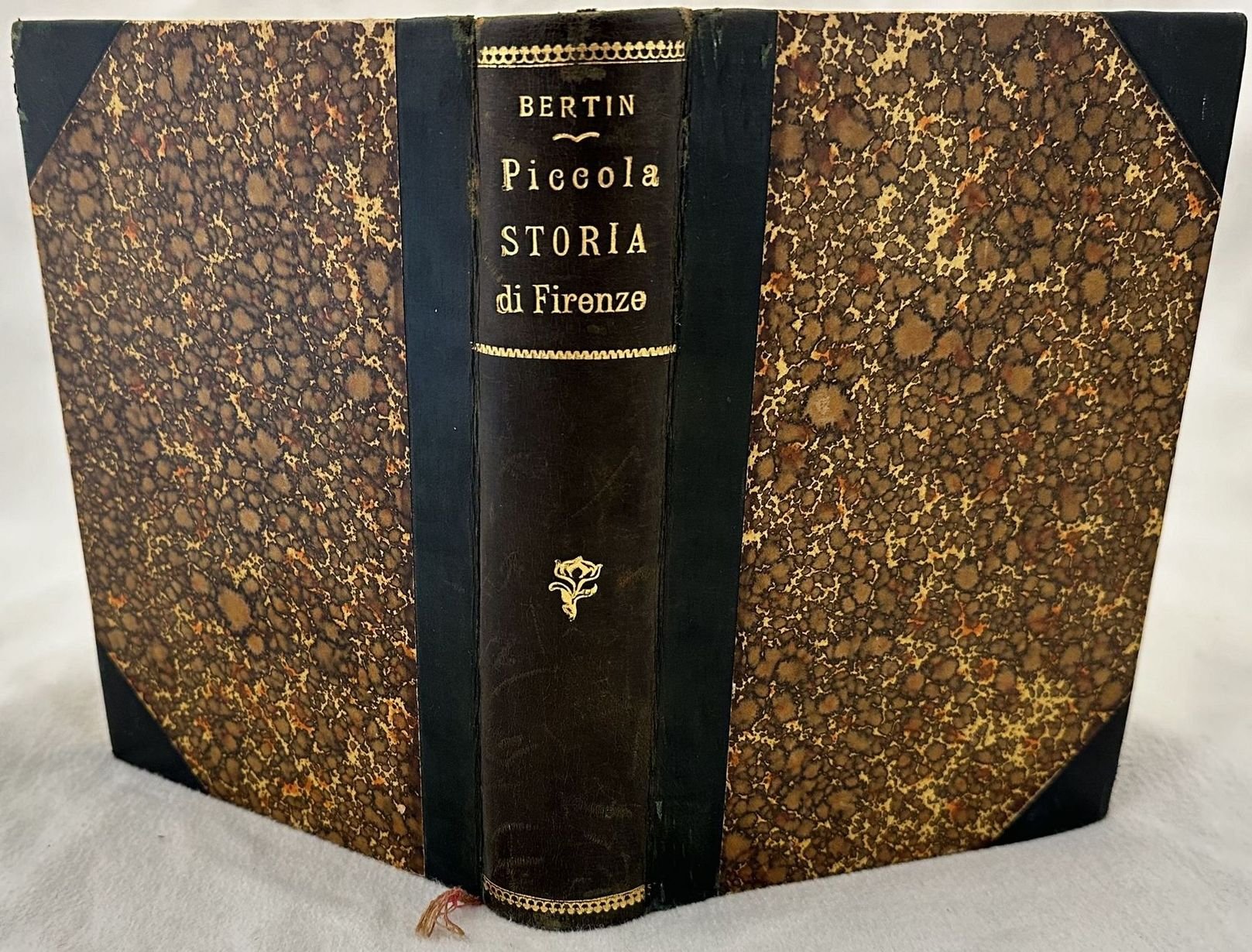 Edizione del 1898 di questa opera sulla storia di Firenze di Emma Bertini. L'autore descrive la storia dall'origine fino alla dominazione medicea. Alcune piccole foto di scorci della città e illustrazioni. In ottime condizioni. Copertina in mezza pelle coeva con titolo e decorazioni in oro al dorso in ottime condizioni generali con lievi usure ai margini e dorso. Legatura in buone condizioni. Pagine in buone condizioni con rare fioriture. In 8. cm 25x17. Pp. XXII+(4)+581. Edition of 1898 of this work about the history of Florence by Emma Bertini. The author describes the history from the orginins until Medici domination. Some little photoes of views. In very good conditions. Half leather coeval cover with gilted title in the spine in very good general conditions lightly worn in the extremities. Binding in good conditions. Pages are in good conditions with occasional foxing. In 8. cm 25x17. Pp. XXII+(4)+581.
