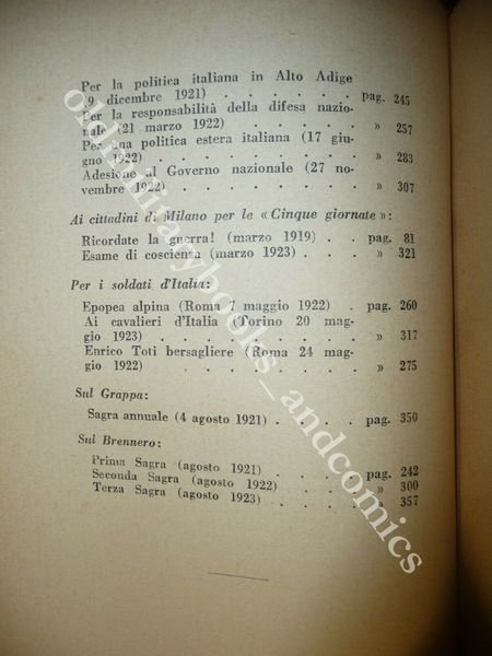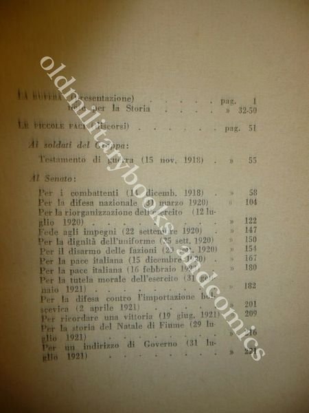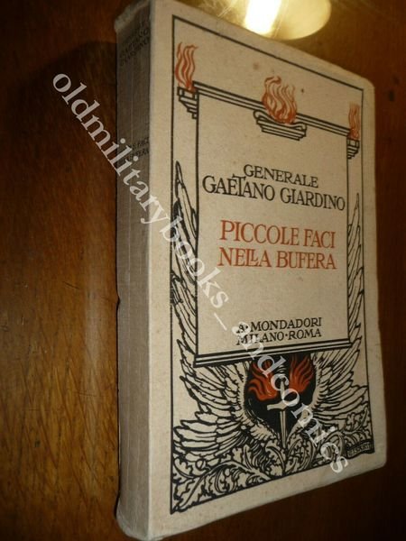 DESCRIZIONE: Mondadori Milano 1924 br. ed. ill. pp. 362 in 16°. Prima edizione della raccolta dei discorsi di guerra del Giardino, Comandante dell'Armata del Grappa, con note sui "contraccolpi della pace sui militari". Il Giardino (Montemagno, 1864-Torino, 1935) uscì dall'Accademia Militare come sottotenente al 8° bersaglieri nel 1882. Prestò servizio in vari reggimenti e venne destinato nel 1887 alle truppe d'Africa, guadagnando a Cassala nel 1894 una Medaglia d'Argento coi pochi ufficiali bersaglieri che componevano il comando e lo stato maggiore delle forze coloniali. Rimpatriato con promozione, prestò servizio al 6° Reggimento Bersaglieri come capitano. Fra il 1904 e il 1911 fu maggiore al 3° Reggimento poi Capo di Stato Maggiore alla Divisione di Livorno e poi di Napoli. Nel 1912, allo scoppio della Guerra di Libia, venne nominato Sottocapo di S.M. del corpo di spedizione. Allo scoppio della Grande Guerra, svolse le funzioni di Capo di Stato Maggiore al IV° Corpo d'Armata e con quelle di Generale al II°, prima di essere nominato comandante della 48a Divisione. Dopo Caporetto tornò al Comando Supremo con Diaz con delega al Comitato consultivo interalleato. Membro del Consiglio dell'Esercito, dal 1923 al 1924 fu governatore dello Stato libero di Fiume e nel 1926 venne nominato Maresciallo d'Italia. CONDIZIONI: Perfette, presente ex-libris a timbro. PESO / WEIGHT: 355 gr. without package