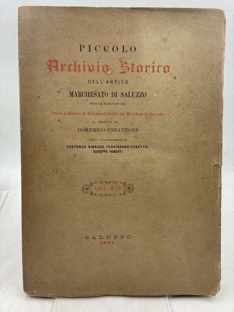 Titolo completo: Piccolo Archivio Storico dell’Antico Marchesato di Saluzzo sotto il patronato del Conte Ludovico di Saluzzo-Crissolo dei Marchesi di Saluzzo, diretto da Domenico Chiattone colla collaborazione di Costanzo Rinaudo, Ferdinando Gabotto, Giuseppe Roberti. Anno I. - N. I-II. Brossura editoriale a stampa (lievi difetti sui bordi), cm 25.5 x 18, pp (4) 162 (2), 3 tavole protette da velina, di cui una a colori. Esemplare a fogli chiusi. Primo fascicolo di questo periodico fondato dallo storico Domenico Chiattone appena ventitreenne. I due numeri qui pubblicati insieme contengono: L. G. Pellissier, Il tunnel del Viso; P. Gabotto, La guerra del Conte Verde contro i Marchesi di Saluzzo e del Monferrato nel 1363; Roberti, I moti di Revello e dell'Alta Valle Po in luglio 1797; Chiattone, I due codici manoscritti della Francesca da Rimini di Silvio Pellico, esistenti in Casa Cavazza a Saluzzo e i loro Annotatori; C. F. Savio, I Conti di Crissolo; Mons. Mattia Vicario, Due lettere di Silvio Pellico; Claudio Moschetti, Un affresco del principio del Secolo XV; Vincenzo Marsengo-Bastia, Tre lettere di M.or F. A. Della Chiesa all'Aprosio; D. Chiattone, Una lettera di Silvio Pellico a Stanislao Marchisio; G. Flechia, Manipoletto di etimologie saluzzesi; D.Chiattone, Appunti di Bibliografia Saluzzese.