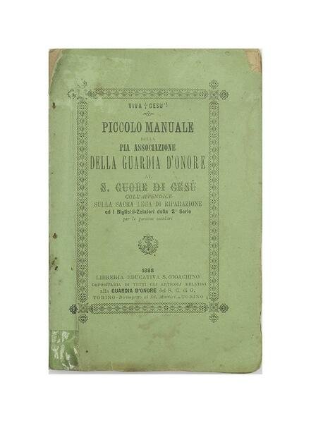 Titolo: Piccolo Manuale della pia associazione della guardia d'onore al S. Cuore di Gesù Edizione: Libreria Educativa S. Gioachino 1888 Dimensioni: 9,5 x 14,5 cm c.a. Pagine: 172 Copertina: Brossura Condizioni: Buone come da foto