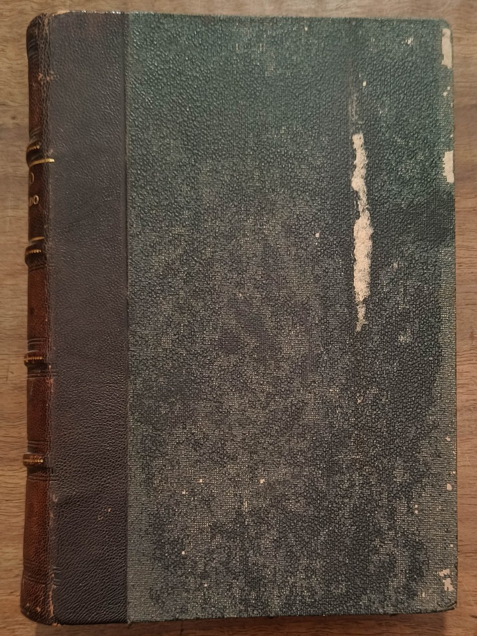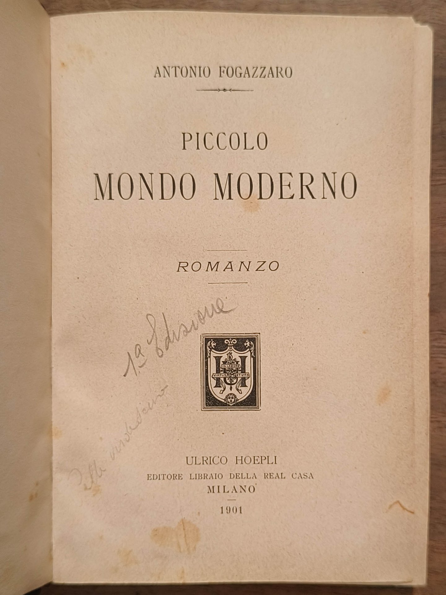 Piccolo mondo moderno, Milano, Hoepli, 1901. Prima edizione. Cm 17,2. Pp. 464. Legatura in mezza pelle marrone e tela verde. Autore e titolo in oro al dorso. Carte di guardia con motivo floreale. Legatura parzialmente staccata alle prime pagine, segni d'usura ai piatti.