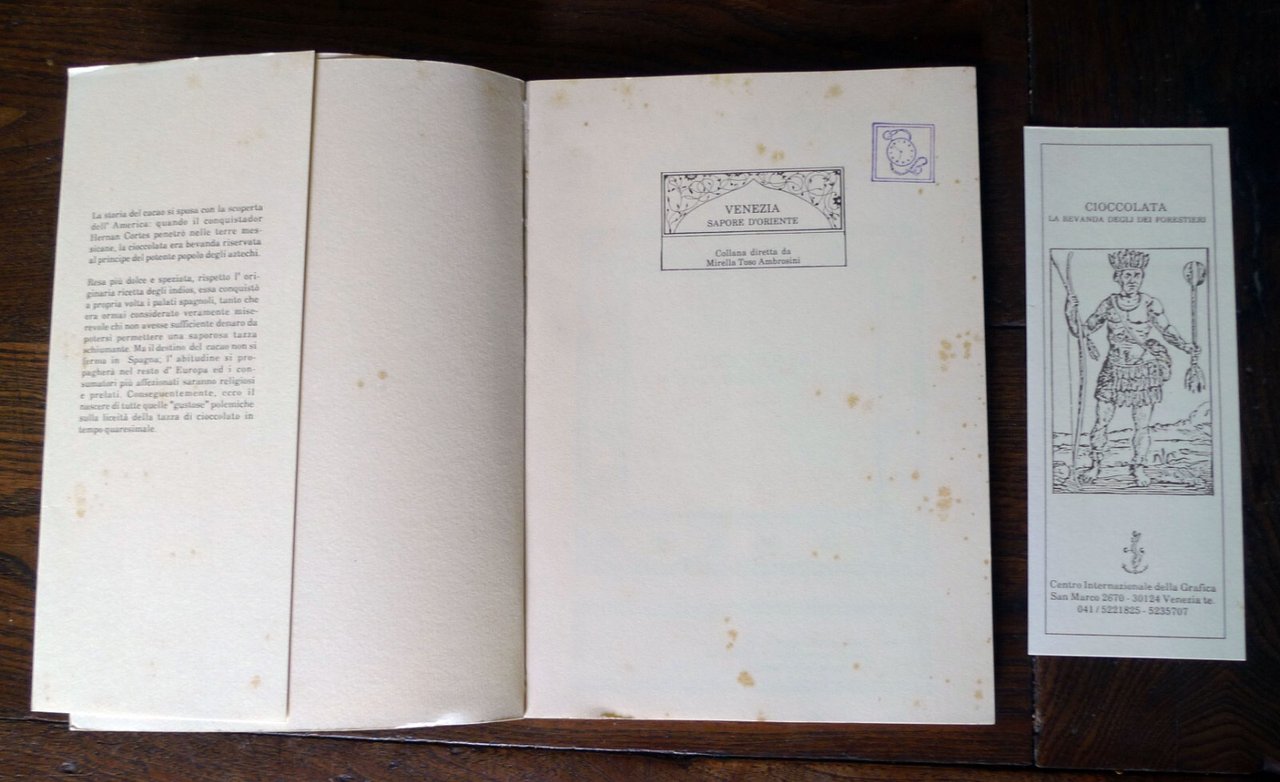 Tiziana Piebani,CIOCCOLATA.LA BEVANDA DEGLI DEI FORESTIERI.Centro Internazionale della Grafica di Venezia,Venezia 1991,tiratura di 800 esemplari,brossura con sovraccoperta, 24x17,5 cm., pp.92,illustrazioni in bianco e nero,VENEZIA SAPORE D'ORIENTE,collana diretta da Mirella Toso Ambrosini,peso: g.350cod.9475CONDIZIONI DEL LIBRO: buone,fioriture in alcune pagine