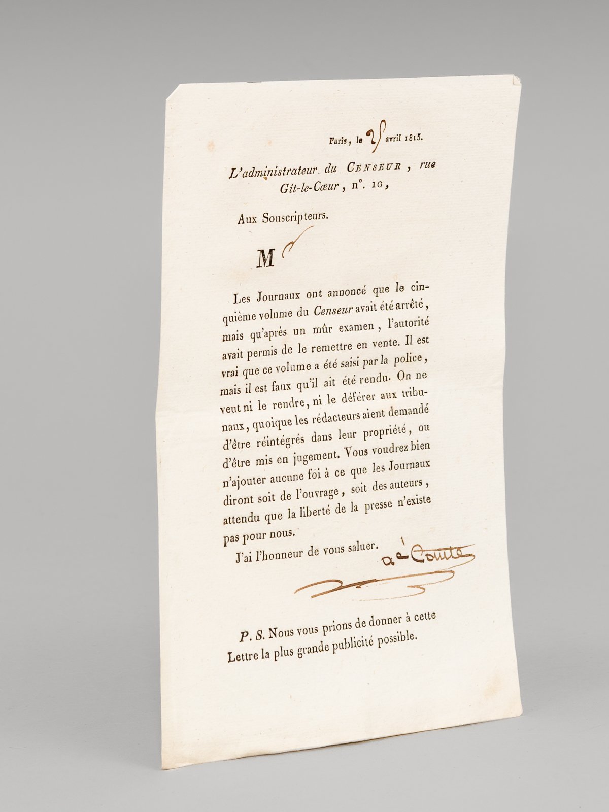 1 brochure format in-12, L'Administration du Censeur, rue Gît-le-Coeur, n°10, Paris, le 25 avril 1815, 2 ff. dont verso du premier imprimé. [ Pièce imprimée complétée et signée par Comte, administrateur du Censeur ] L'administrateur du Censeur, rue Gît-le-Coeur, n°10, Paris, le 25 avril 1815, "Aux souscripteurs, Mr., Les Journaux ont annoncé que le cinquième volume du "Censeur" avait été arrêté mais qu'après un mûr examen, l'autorité avait permis de le remettre en vente. Il est vrai que ce volume a été saisi par la police, mais il est faux qu'il ait été rendu [. ] P.S. : Nous vous prins de donner à cette lettre la plus grande publicité possible" Remarquable pièce imprimée complétée et signée de la main de Comte, gérant du journal, témoignant d'un cas de censure aux débuts des Cents Jours. Napoléon Ier, de retour de l'île d'Elbe, venait de s'installer au palais de l'Elysée le 17 avril 1815, et "l'Acte additionnel aux constitutions de l'Empire" avait été publié le 22 avril. Le Journal "Le Censeur, ou Examen des actes et des ouvrages qui tendent à détruire ou à consolider la constitution de l'Etat", par Comte et Dunoyer, parut de juin 1814 au 6 septembre 1815. Hatin indique qu'il s'agit du "seul journal de l'époque véritablement indépendant. Parut d'abord par livraisons de 2 ou 3 feuilles ; après la loi du 21 octobre pour échapper à la censure, il ne parut plus qu'à des époques indéterminées [ . ] Le 7e volume, longtemps retenu sous les scellés, se trouve difficilement". Très bon état. Hatin, 317