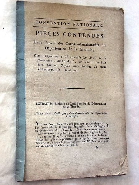 PIÈCES CONTENUES dans l'envoi des Corps administratifs du Département de la Gironde, dont l'impression a été ordonnée par décret de la Convention, du 18 avril, sur l'adresse lue à la barre par les députés extraordinaires du même département, le dudit-jour.