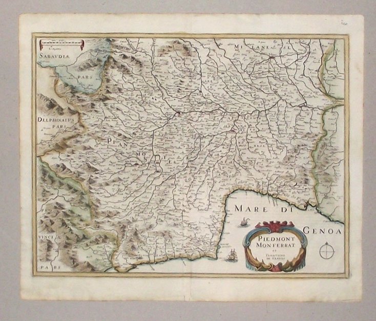 >Incisione originale in rame (cm. 36,5x48,5 e margini) abilmente colorata da mano coeva. Tratta dall'Atlante: Théâtre géographique de France...Riedizione della carta: "Pedemontana regio cum Genuensium territorio et Montisferrati Marchionatu" pubblicata dal Mercatore nel 1589 nella raccolta di carte dell'Italia, Slavonia e Grecia e inserita nell'Atlas del 1595 (cfr.). La carta presenta alcuni toponimi delle valli valdesi: la Val d'Angrogna è situata a sud della Val Luserna. Rara. F. Barrera, Il Piemonte nella cartografia del Cinquecento e Seicento, n. 104