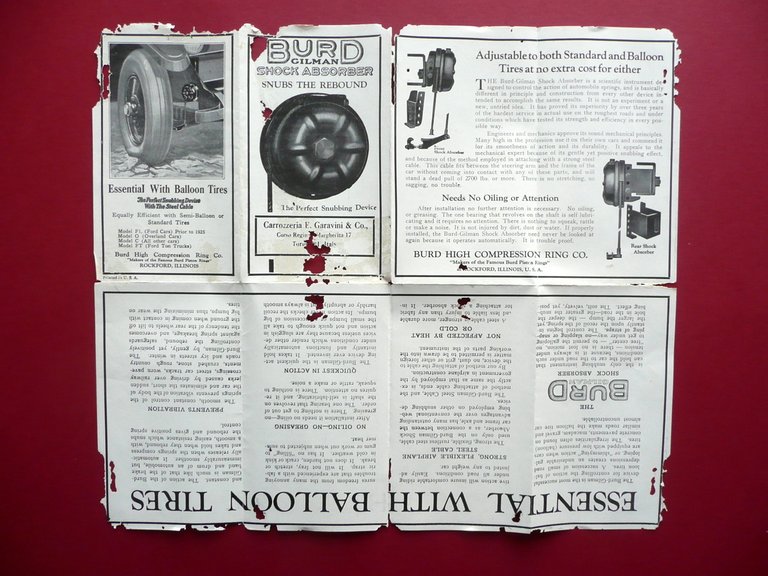 Pieghevole pubblicitario, Burd Gilman Shock absorber snubs the rebound the perfect snubbling device - Carrozzeria E. Garavini & Co. - Corso Regina Margherita 17 Torino - Italy Printed in USA, s. d. (anni '20 del Novecento); pieghevole pubblicitario a stampa, ill. in b/n. Cm 31x35,5 (aperto); cm 15,5x9 (chiuso). Testo in inglese. Condizioni di conservazione Esemplare in condizioni pi√π che discrete con tracce d'uso, alcune piccole mancanze (danni da tarlo) che in qualche caso comportano piccole perdite di testo. Qualche piccola lieve abrasione. SC03.D13541 N