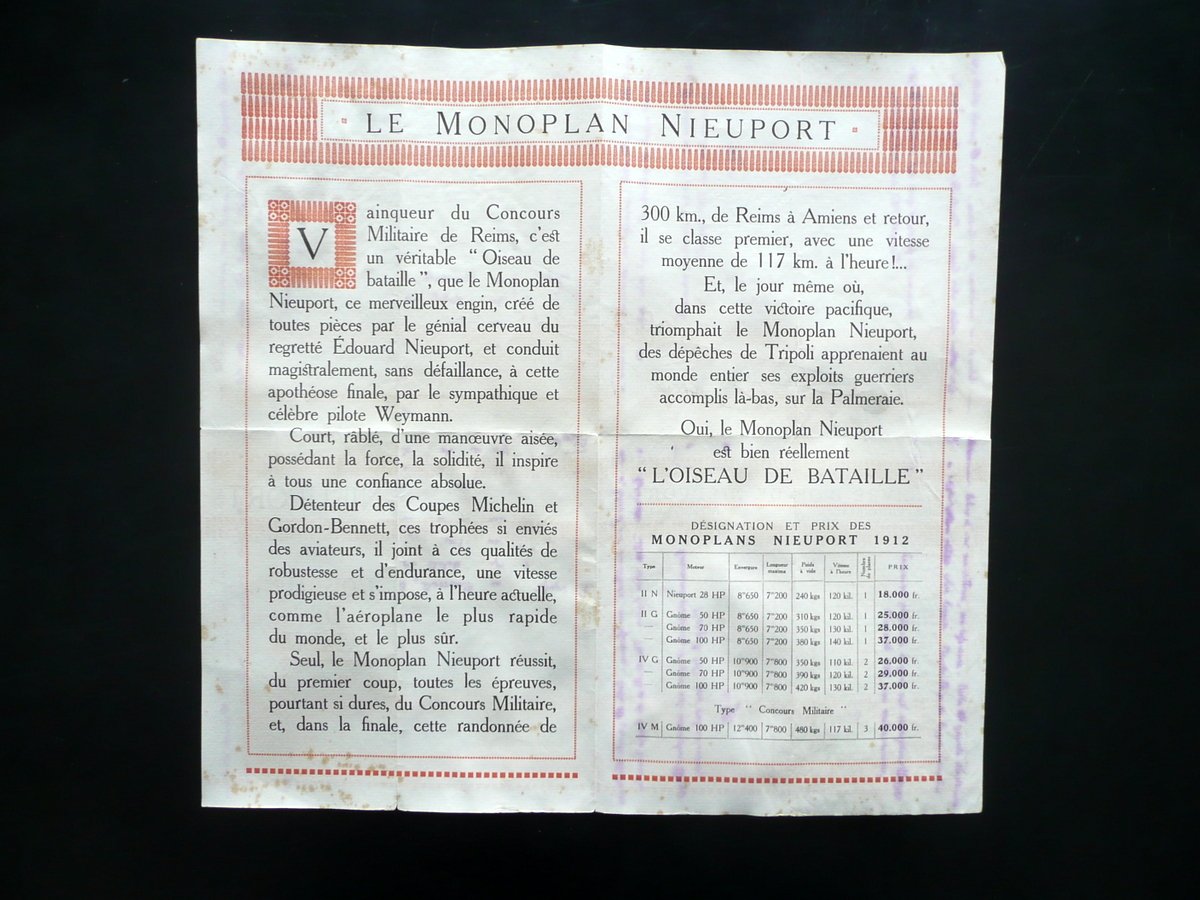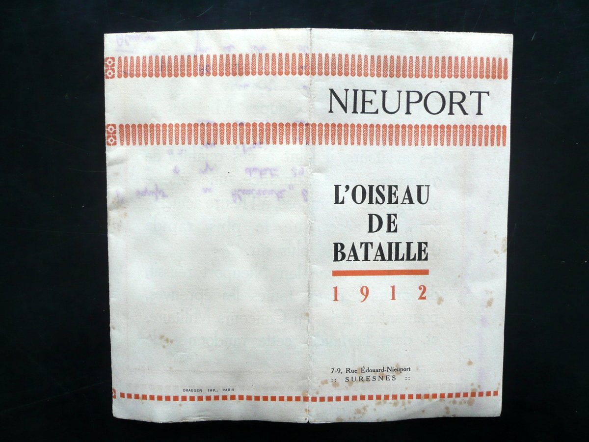Pieghevole, Le Monoplan Nieuport L'Oiseau de Bataille 1912 7-9 Rue Edouard-Nieuport Suresnes Draeger Imp., Paris, 1912; pieghevole a stampa con bella grafica a colori; cm 32x33. Testo in francese. Condizioni di conservazione Esemplare in condizioni più che discrete con tracce d'uso, alcune piccole lievi bruniture, lievi ondulazioni e alcuni leggeri aloni da inchiostro, dovute ad eccesso di umidità (esemplare danneggiato da allagamento del locale causa maltempo, vedi foto). SC03.D13433 N