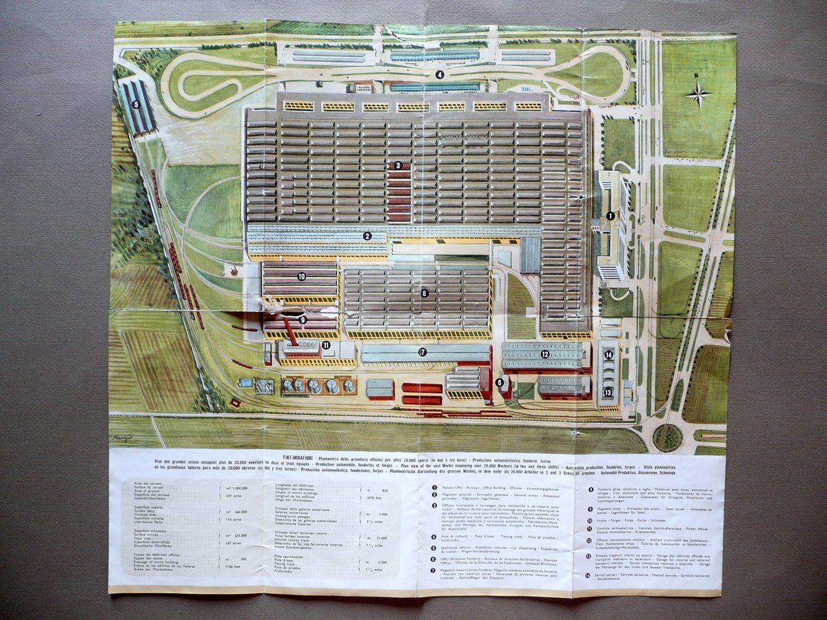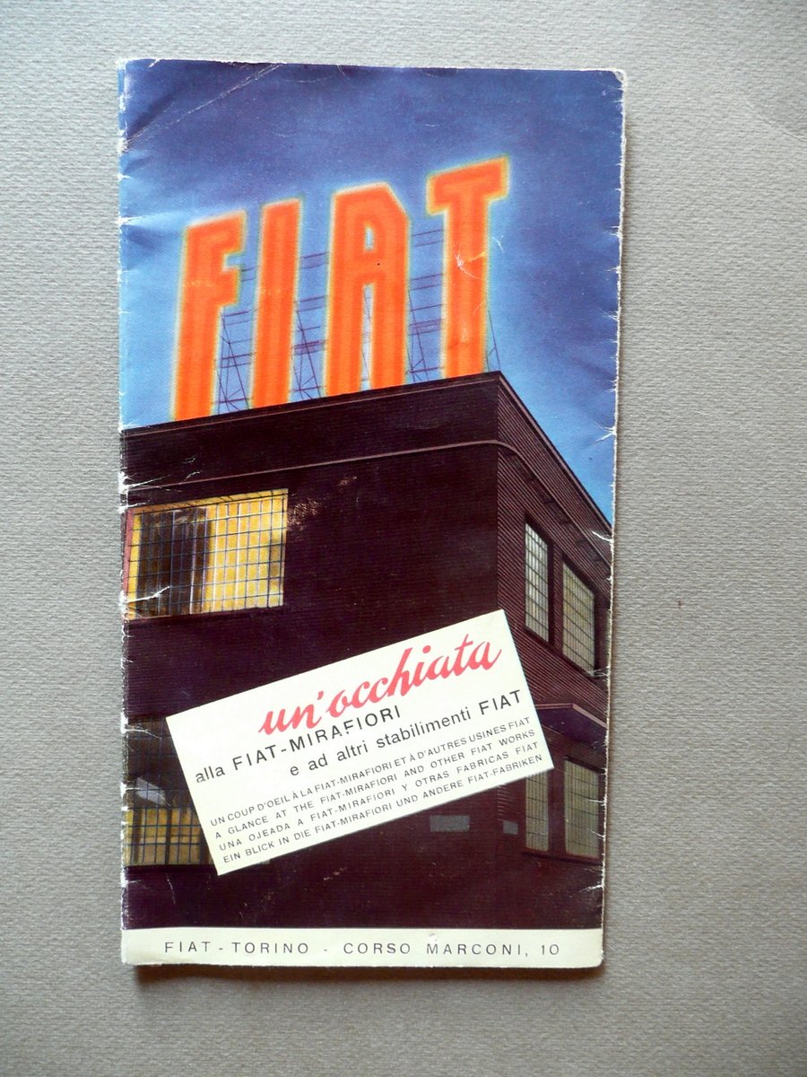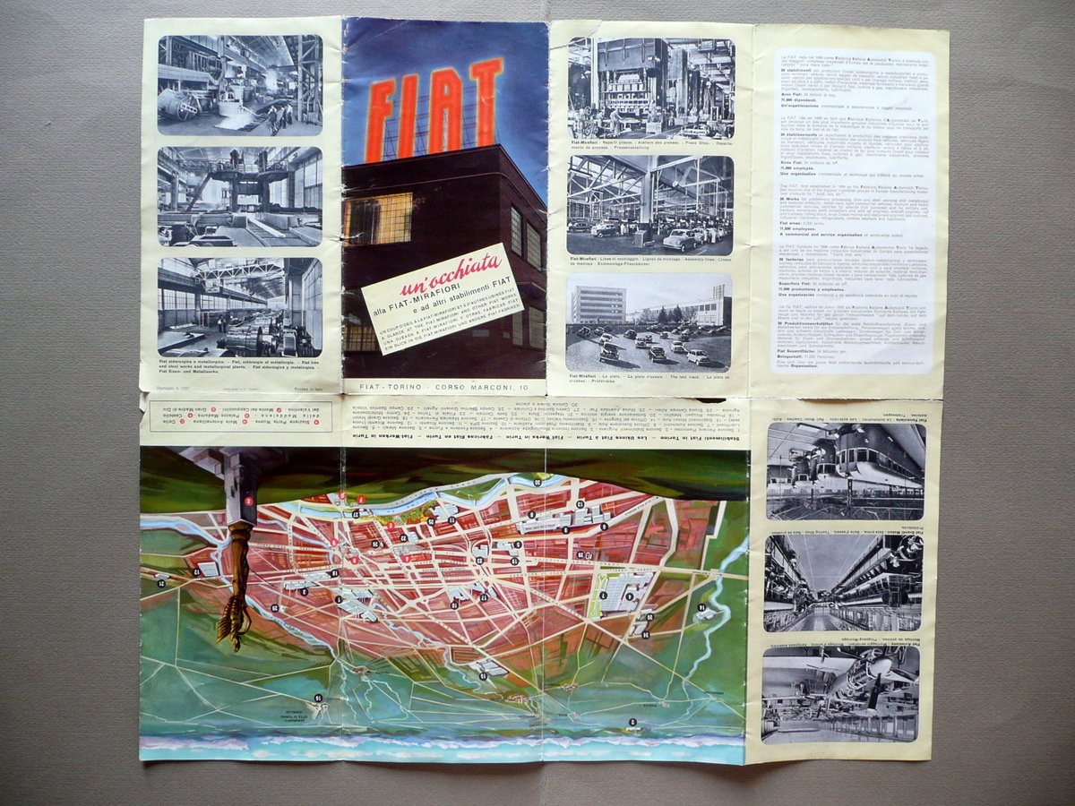 Pieghevole, FIAT Un'occhiata alla FIAT - Mirafiori e ad altri stabilimenti FIAT Gros Monti & C., Torino, s. d. (anni '50 del Novecento circa); pieghevole pubblicitario a stampa, ill. in b/n e a colori, con pianta a col. dello stabilimento di Mirafiori e con una carta a colori degli altri stabilimenti FIAT in Torino. Cm 23x12,5 (chiuso); cm 46x50 (aperto). Testi in quattro lingue (italiano, inglese, spagnolo, tedesco). Condizioni di conservazione Esemplare complessivamente ben conservato con tracce d'uso; margini con qualche strappetto generalmente di piccola entità, poche minuscole mancanze in corrispondenza delle pieghe conservative; presenza di uno strappo di alcuni cm e di una minima abrasione in corrispondenza di una piega (vedi foto). Testi in italiano, inglese, spagnolo, tedesco. Realizzato dalla Gros Monti & C. di Torino. SC03.D11496 N