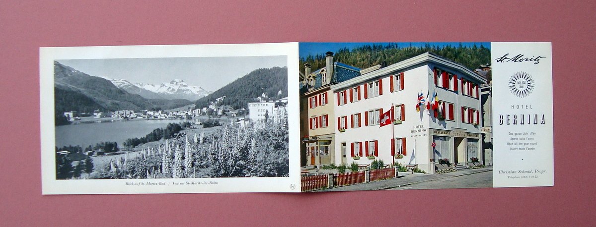 Pieghevole, St. Motitz Hotel Bernina s.d.; cm 11x19; pieghevole ill. a colori e b/n; testo in 4 lingue (tedesco, italiano, inglese, francese). Condizioni di conservazione. Esemplare in ottime condizioni. SC03.D17740 blu