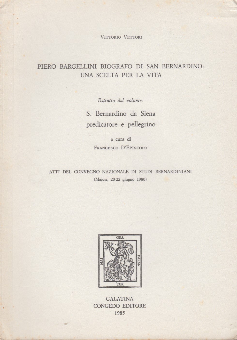 Estratto In-8 (Cm 24 x 17), pp. da 213 a 215. Estratto dal volume: S. Bernardino da Siena predicatore e pellegrino. OTTIMO