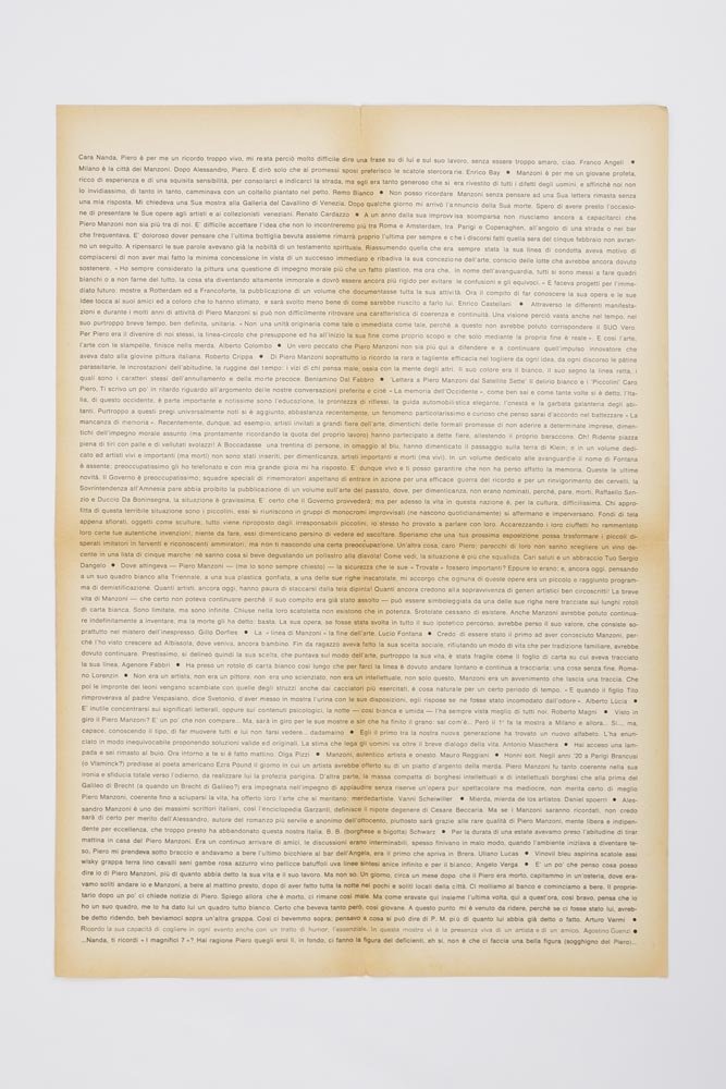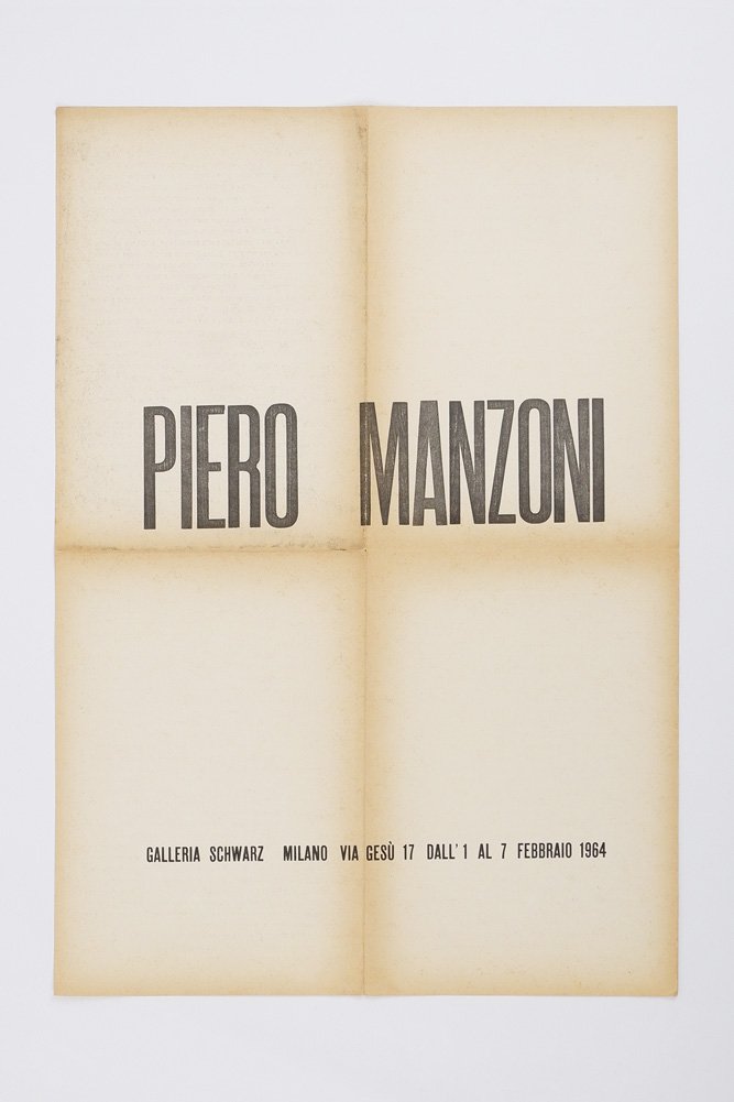 EPHEMERAPoster originale.Bruniture marginali e lungo i punti di piegatura, nel complesso un buon esemplare.Poster originale della prima mostra postuma a un anno dalla morte di Piero Manzoni. Al verso raccolta di pensieri in memoriam del geniale artista morto poco meno che trentenne il 6 febbraio 1963: Baj, Castellani, Gillo Dorfles (firma il pezzo più lungo, ‘Lettera a Piero Manzoni dal Satellite Sette’), Fontana, Schwarz, Scheiwiller, Dal Fabbro e altri.