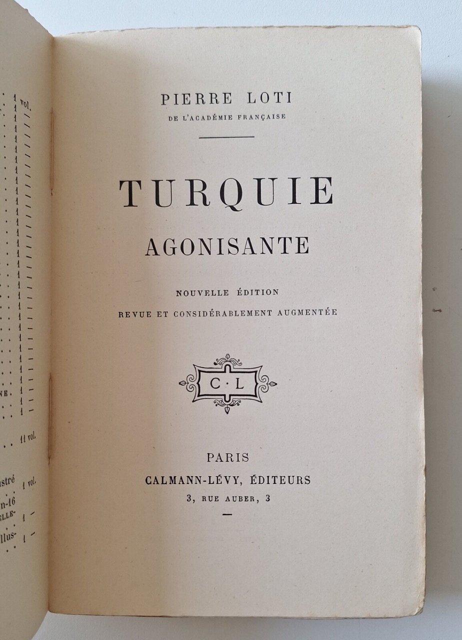 PIERRE LOTI TURQUIE AGONISANTE CALMANN LEVY 1913 36° EDITIONIn 8°, legatura editoriale, copertina illustrata.Piccole mancanze al dorso, lievi segni del tempo. pagine fresche e pulite.
