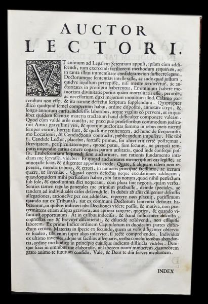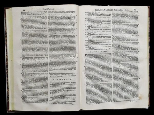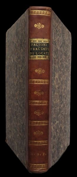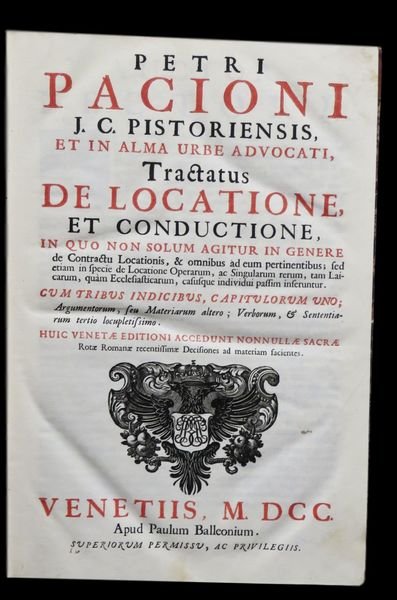 In 2° (32x22 cm); (24), 440, (90) pp. Bella legatura settecentesca in mezza pelle con titolo e ricchi fregi in oro al dorso. Frontespizio in rosso e nero. Tagli gialli. Stemma al frontespizio con un'aquila bicipite con una corona tra le due teste, al centro in uno stemma le iniziali PB intrecciate simmetricamente. Iniziali dallantico proprietario al margine basso del dorso che identifica lesemplare come appartenuto a Monsignor Giuseppe Zacchia che fu uditore della Sacra Rota e governatore di Roma intorno al 1840, appartenente alla nobile famiglia dei Marchesi Zacchia fu un personaggio che ebbe anche un importante ruolo nella vita culturale del territorio ascolano nella prima metà del XIX° secolo. Zacchia fu anche delegato della Provincia di Campagna e Marittima, delegato di Viterbo. Zacchia fu una delle figure più influenti del vaticano nei turbolenti anni dei moti carbonari e rivoluzionari della prima metà del XIX° secolo. Nel 1826 fu inviato nel Frusinate a dirigere le operazioni di Polizia dopo che era divenuto celebre per aver respinto militarmente un assalto dei carbonari a Ripatransone. Qui riuscì a scoprire i capi settari facendoli condannare a pene detentive ed allesilio, facendo redigere un elenco "degli individui ,che appartengono alla Setta dei Carbonari ,dei sospetti per le loro idee politiche nelle province di Marittima e Campagna Nicola. Non comune edizione, in bella legatura ed in ottime condizioni di conservazione di questo testo di diritto dallavvocato e giureconsulto pistoiese, Pietro Pacione (a volte riportato anche come Pacioni). Questo trattato legale, composto nel seicento, ebbe un notevole successo e diverse riedizioni, tutte abbastanza rare. Pietro Pacione, originario di Cutigliano in provincia di Pistoia, era figlio di Francesco Pacioni e fratello minore di Giuliano Pacioni, visse la maggior parte della sua vita a Roma dove esercitò con notevole successo la professione di avvocato. In età matura, per le sue grandi doti e conoscenze, venne invitato dai Principi di Toscana, ad occupare la carica di Auditore presso la Rota toscana. Tale era la sua fama che papa Innocenzo XI che era solito servirsi dei sui scritti, gli offrì il vescovato di Nocera che però Pietro ricusò. Opera non comune ed in buone-ottime condizioni di conservazione. Rif. Bibl.: IT\ICCU\MILE\006703.